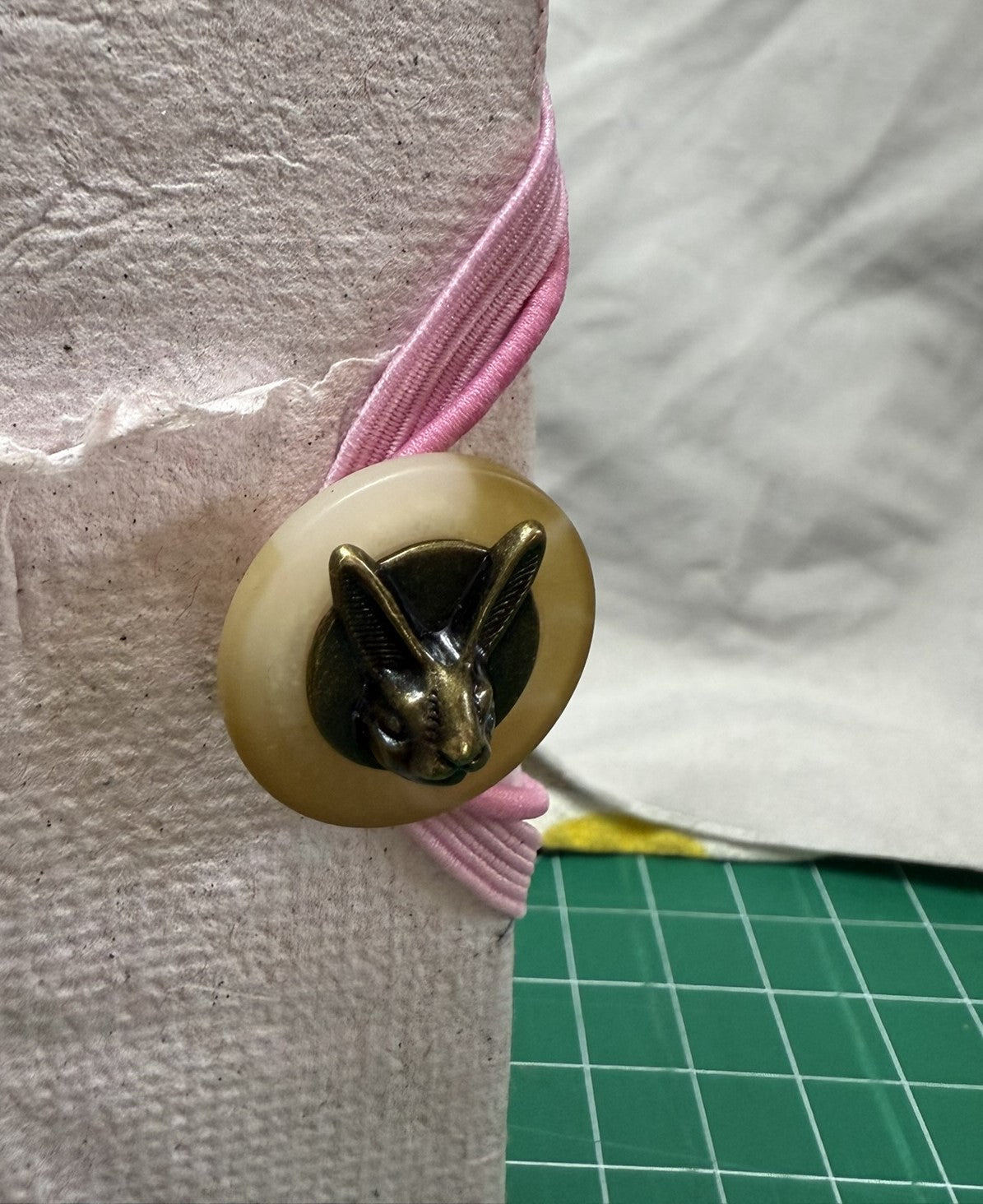 Closure: Resin off white and brown button with brass bunny head detail