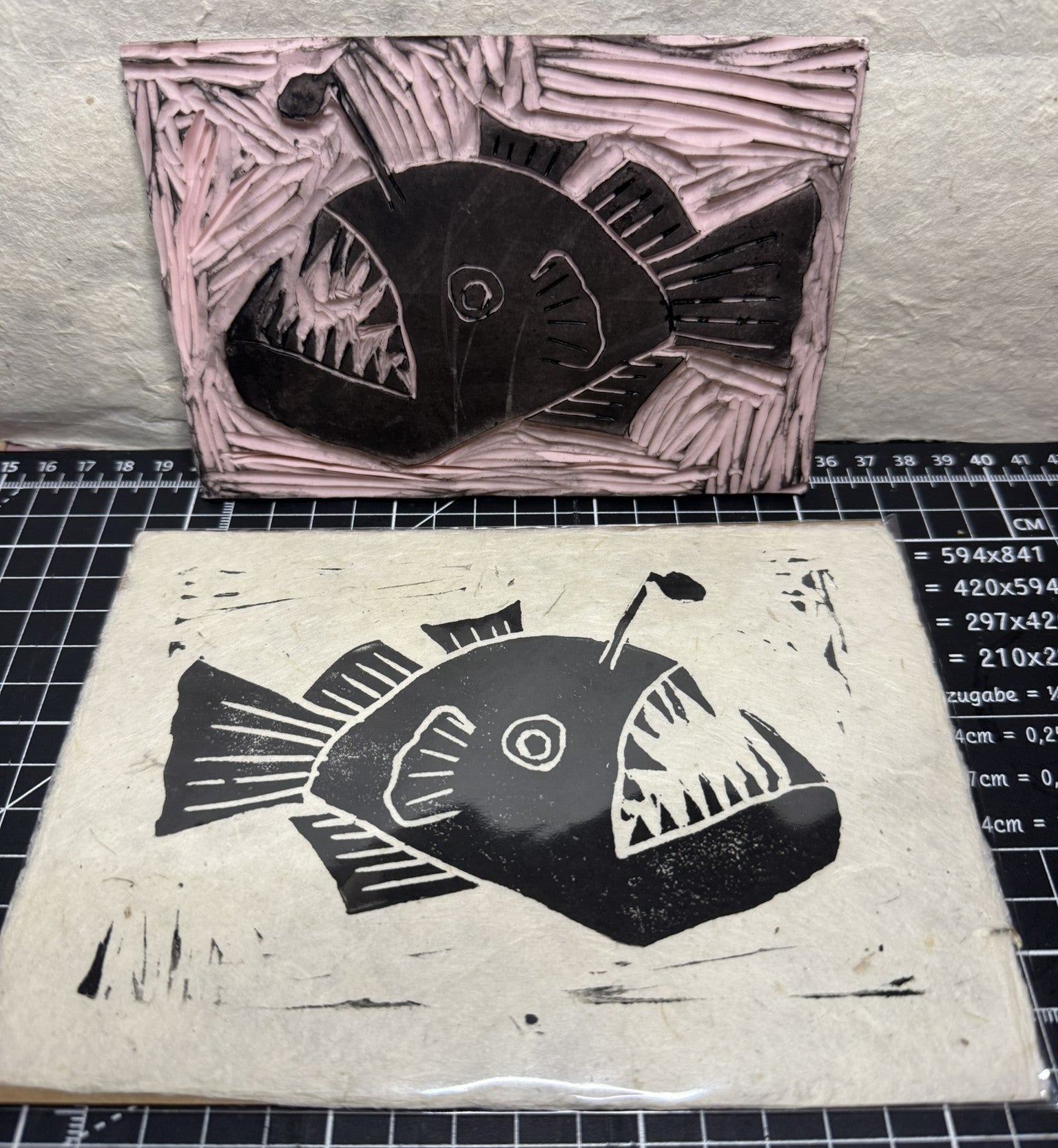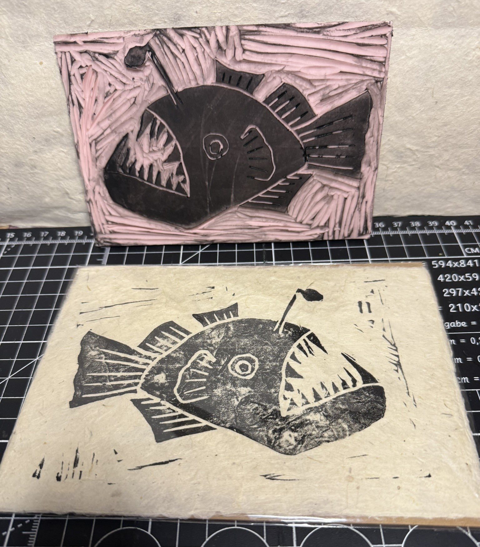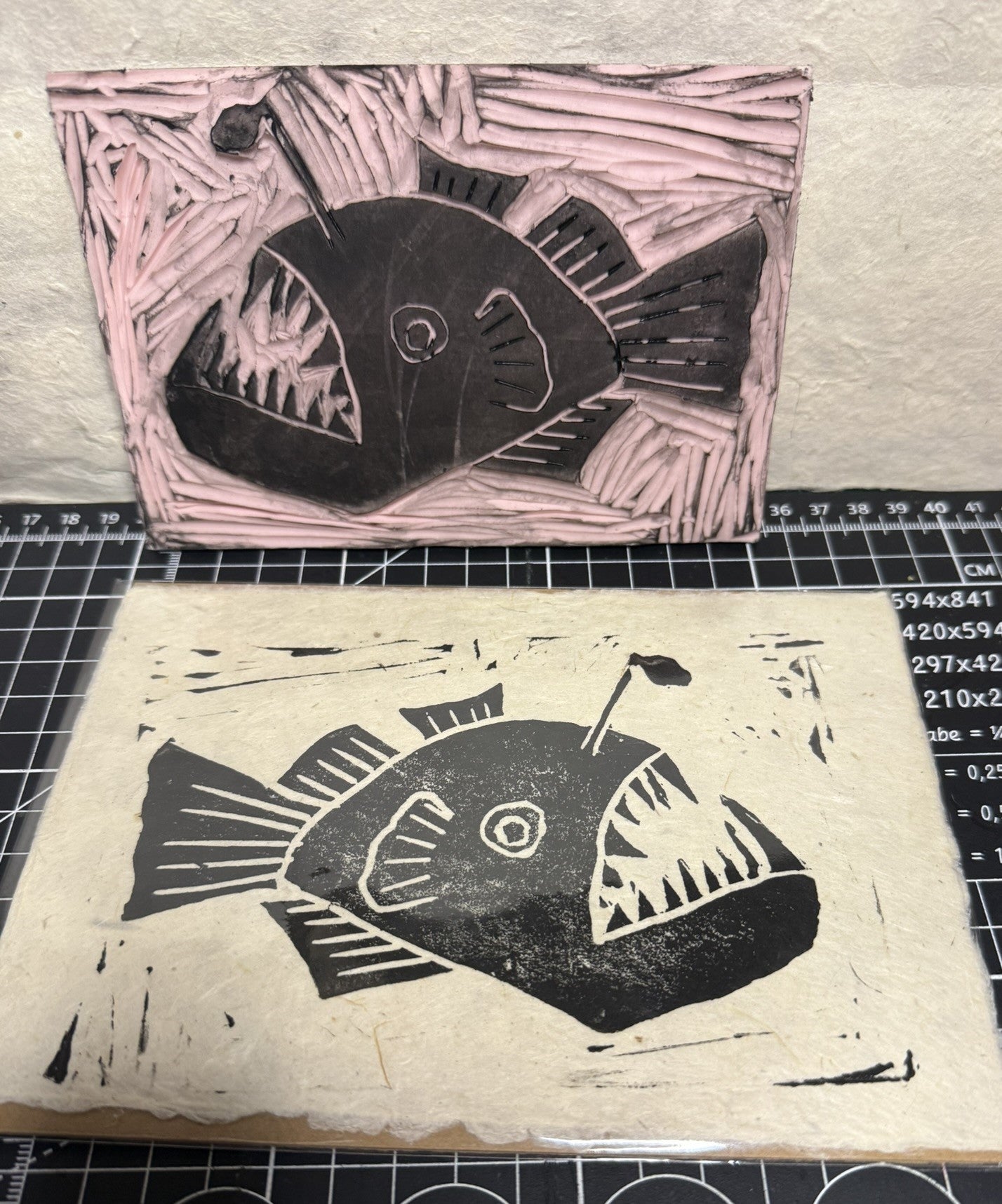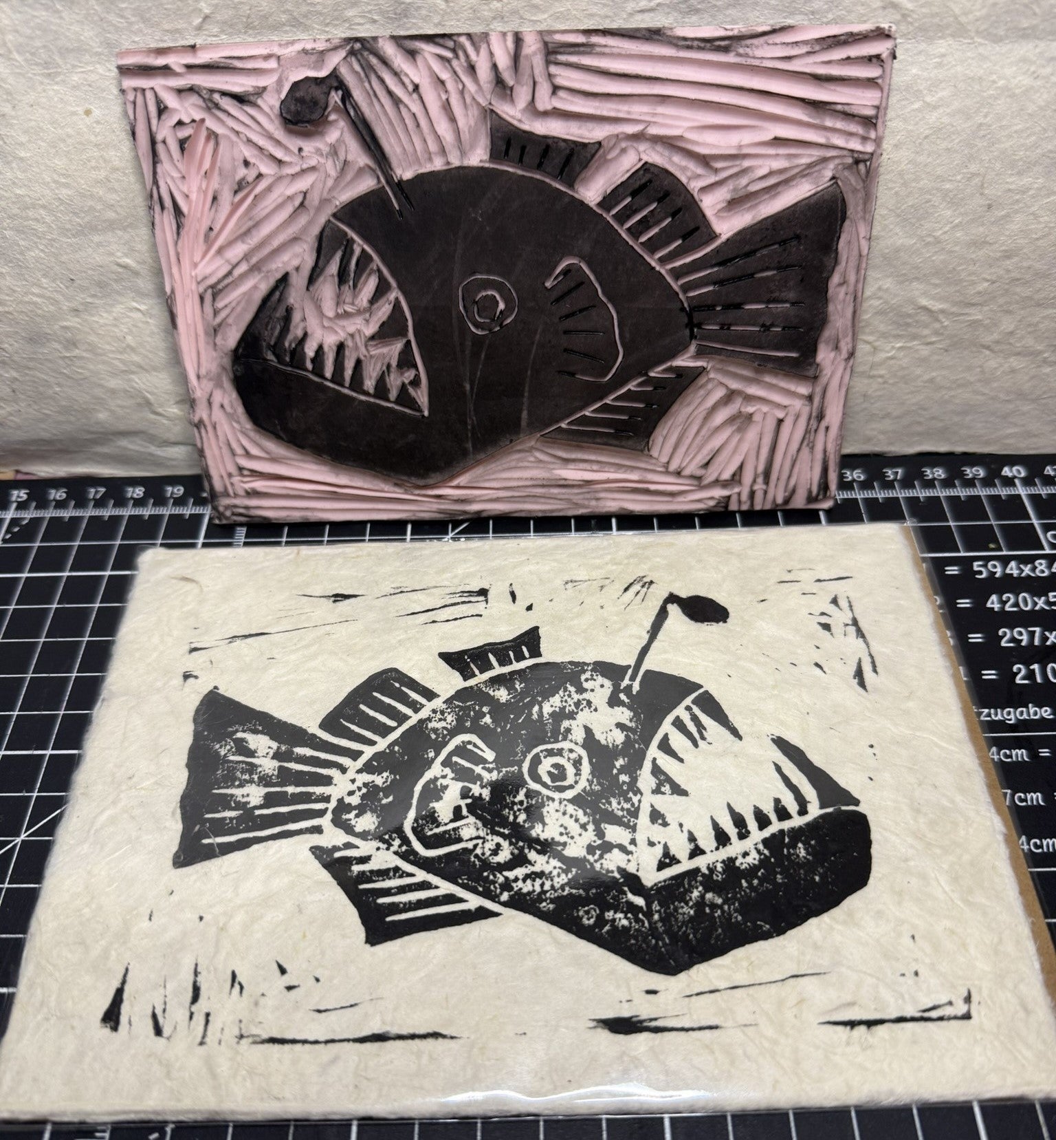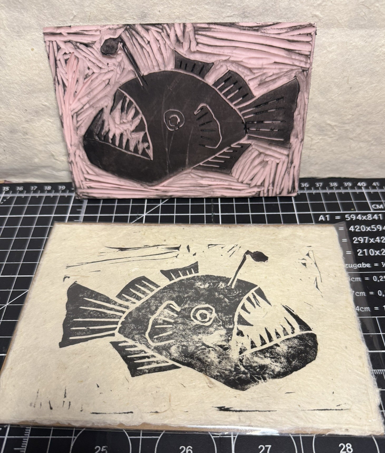 Printed by hand on 5x7 lokta paper using Speedball ink. Signed and dated on the back, sealed in a sleeve with cardboard backing so it arrives ready to haunt your walls (or charm someone else's).