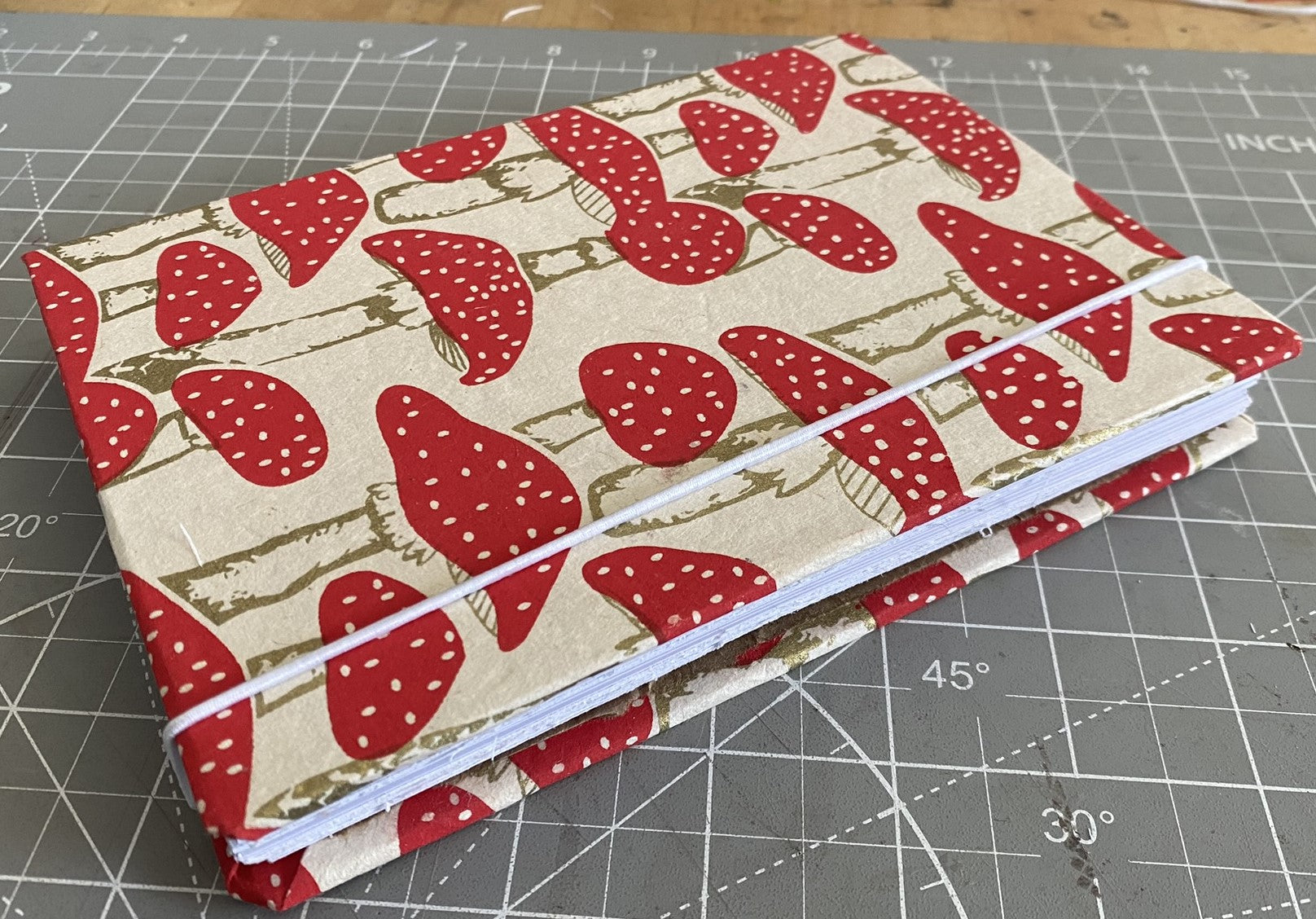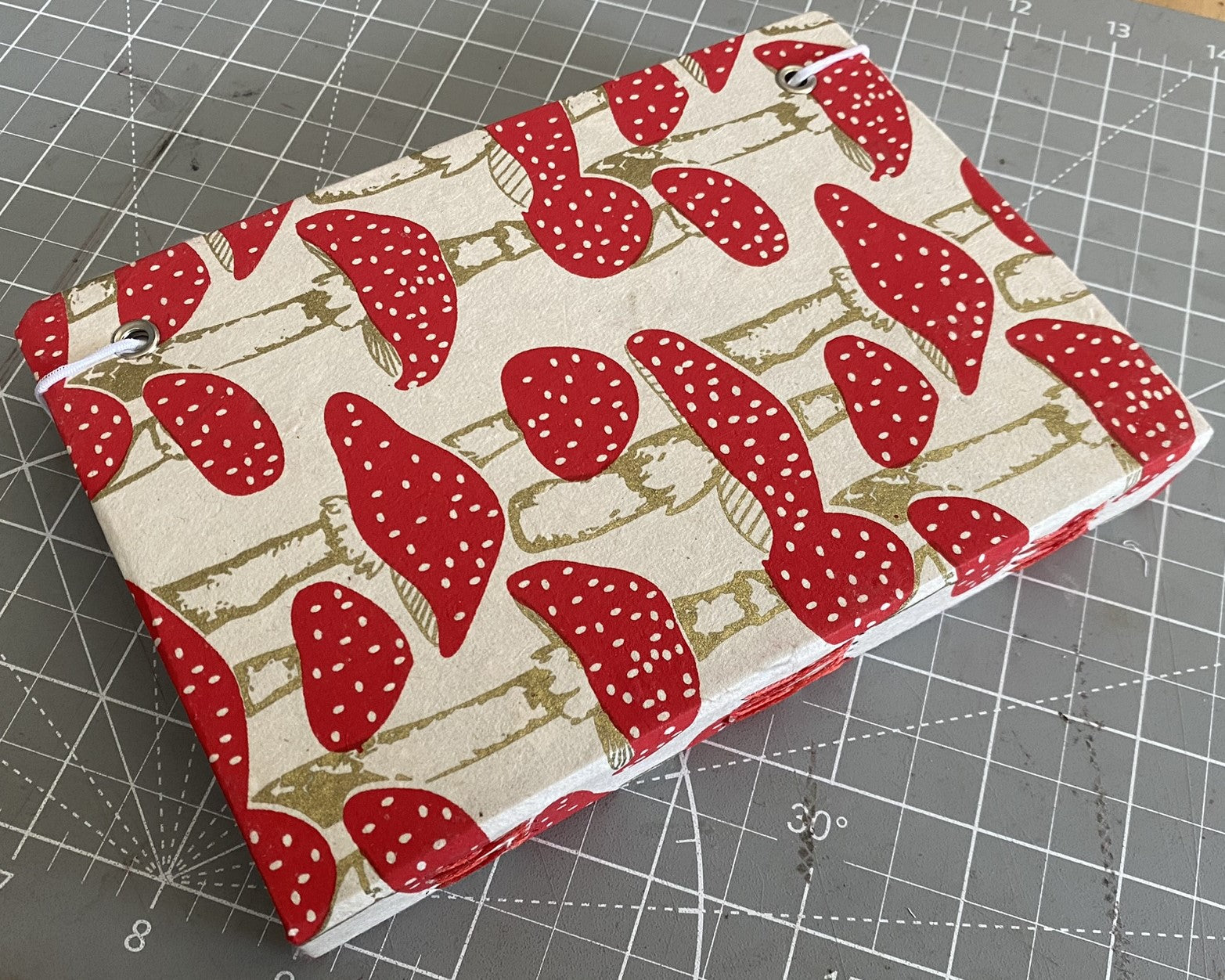 Exterior mushroom paper w/white elastic and silver grommets.