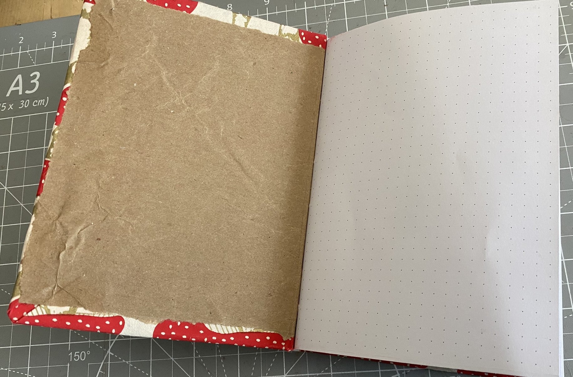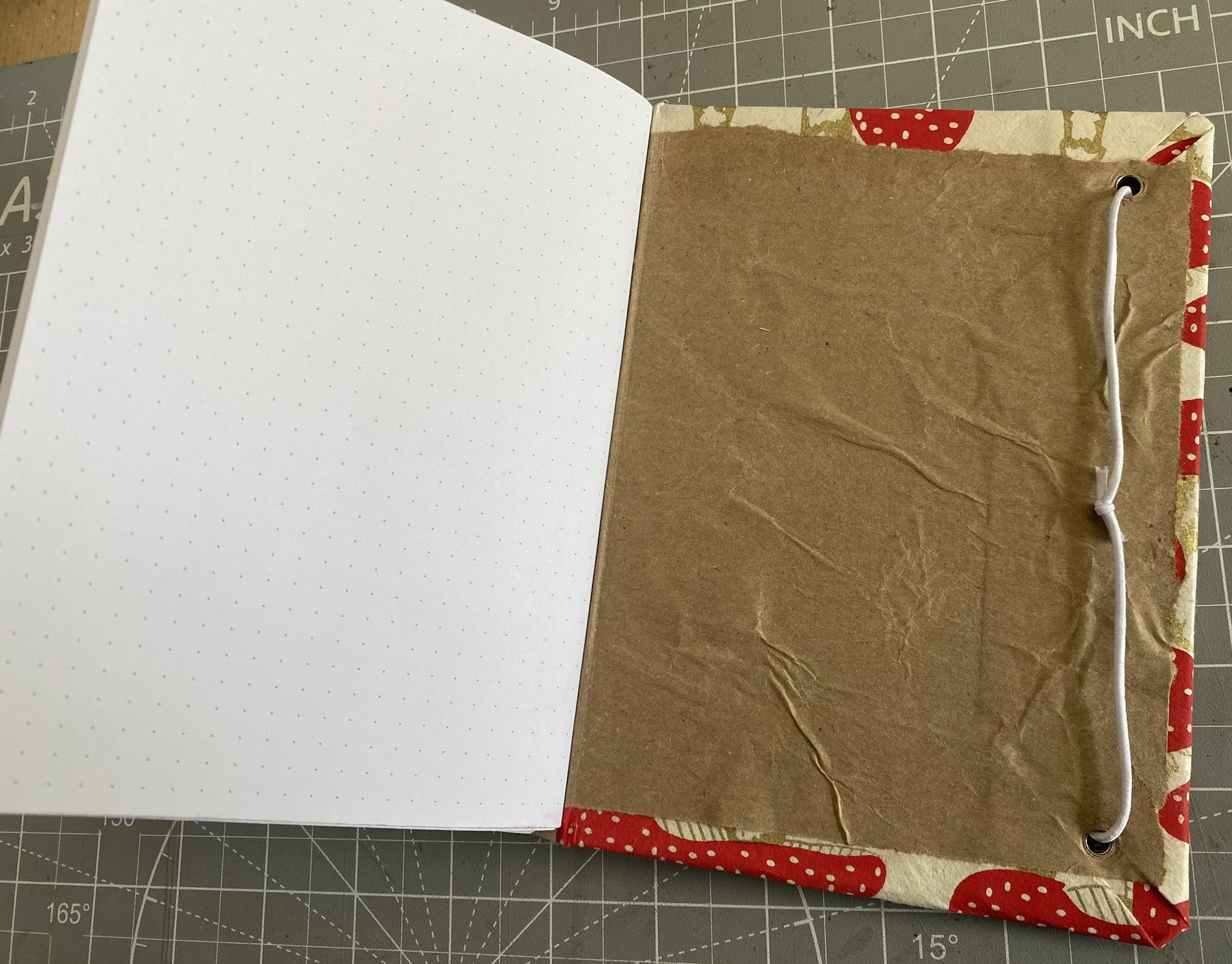 The cover features soft, textured Nepalese Lokta Paper with a brown kraft paper interior lining. Inside, you’ll find 96 dot-grid pages (24 per section) at a quarter-inch scale—perfect for doodling, jotting, and organizing. An elastic band wraps snugly around the journal, keeping your notes and extra papers safe.