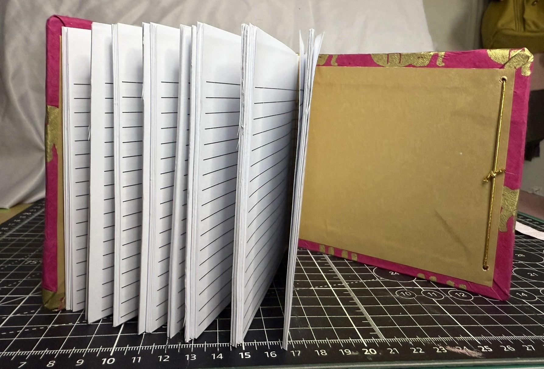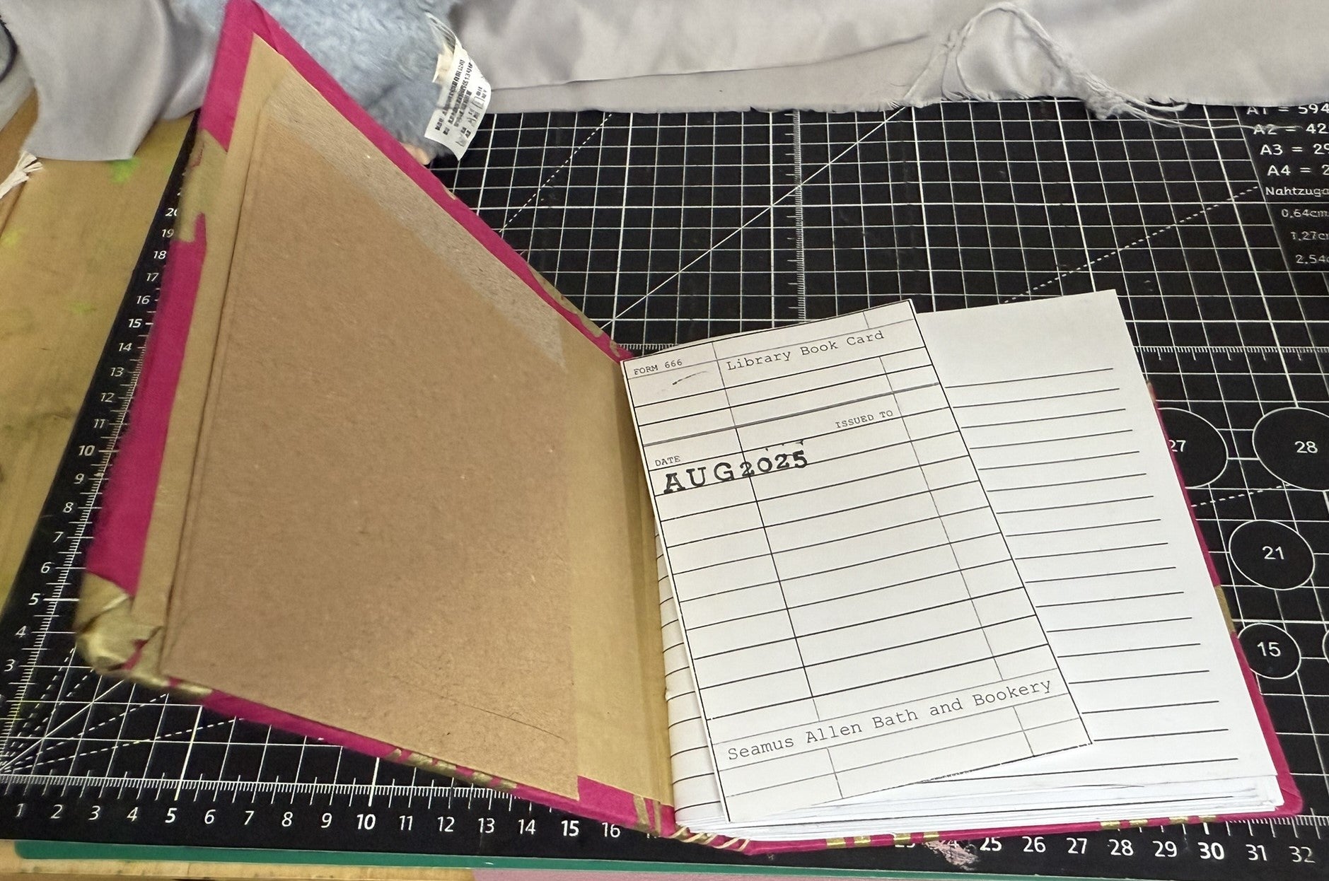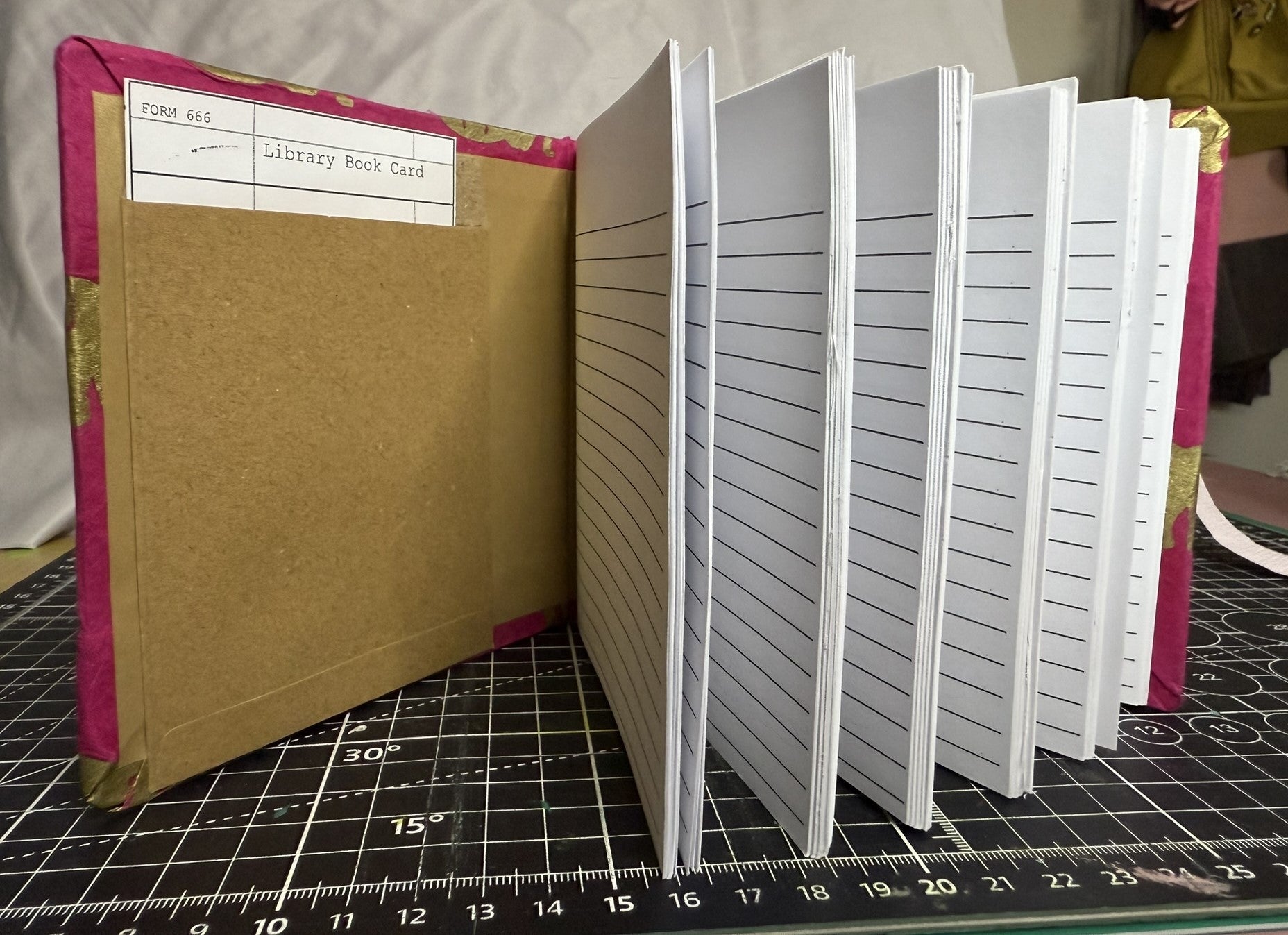 (2) Mismatched resin buttons, one clear pink and one solid pink, and gold elastic keeps everything secure, while inside, gold lokta paper lines the covers and 120 hand-printed, acid-free lined pages wait for your notes, sketches, or daily reflections. Finished with a stamped library card pocket marking the date this book was made.