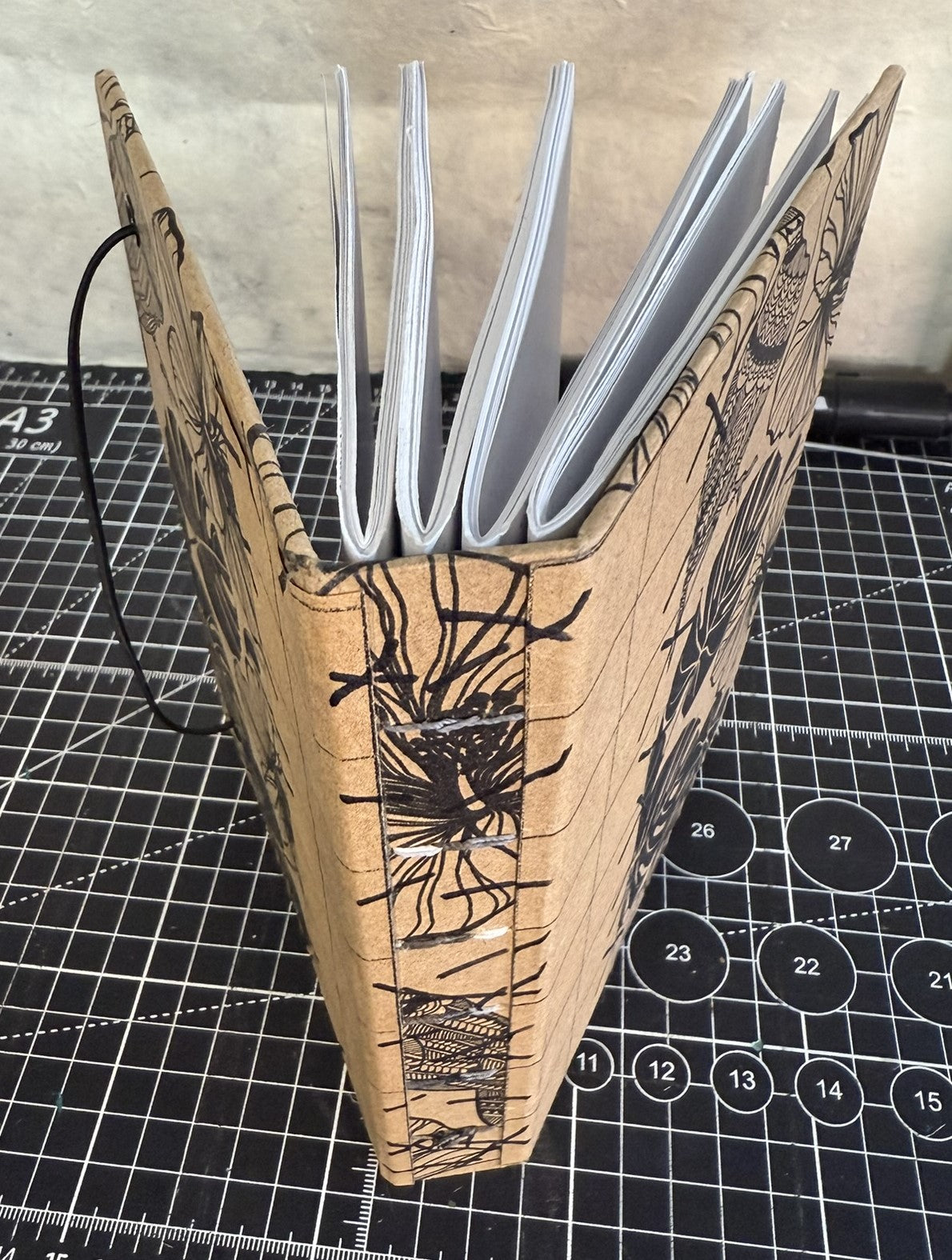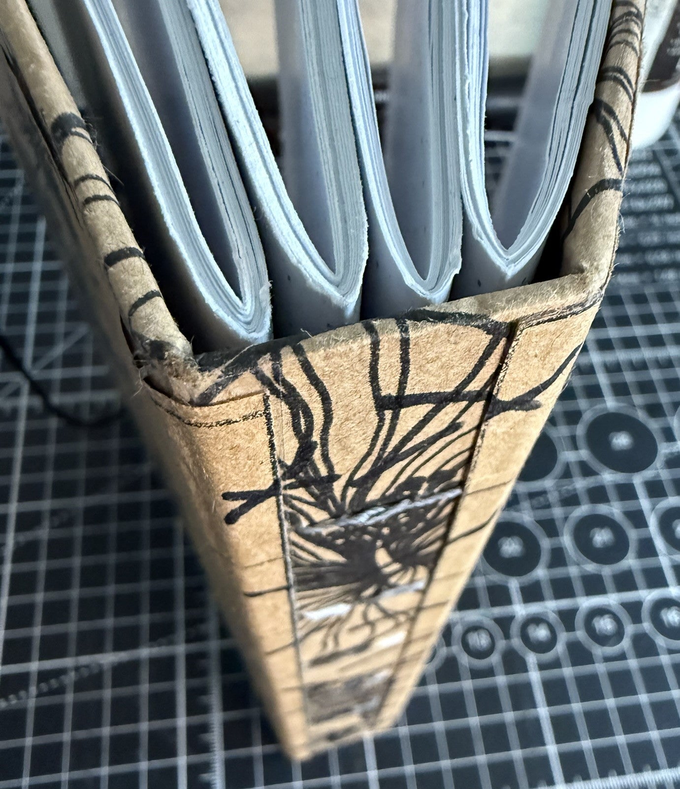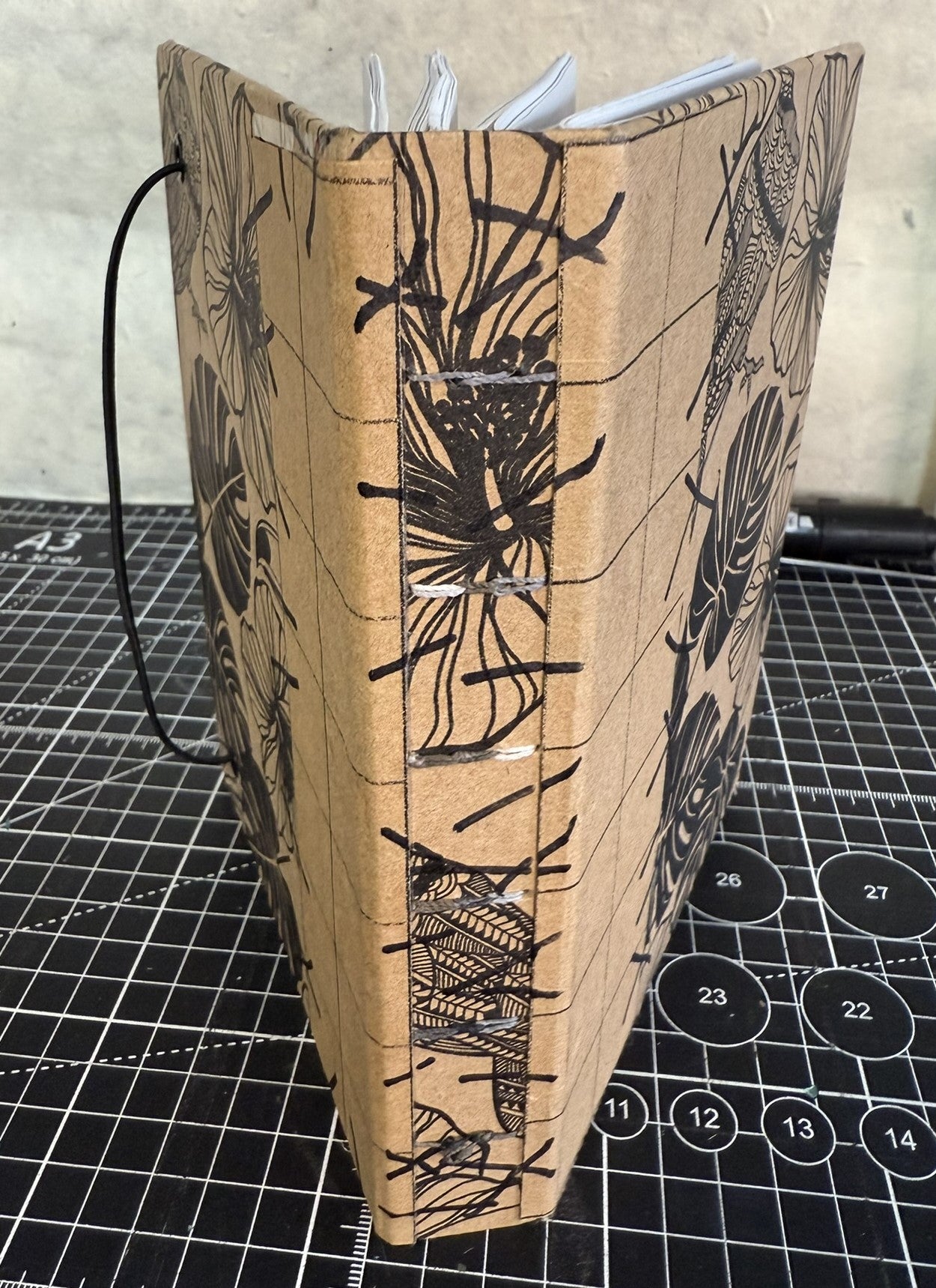 Binding: Hand-stitched link stitch with gradient white-to-black waxed thread