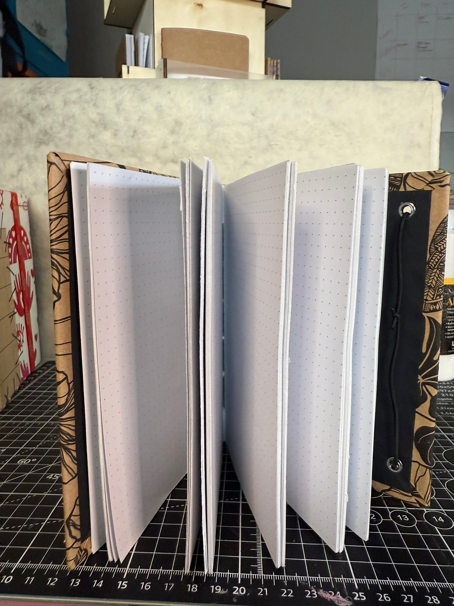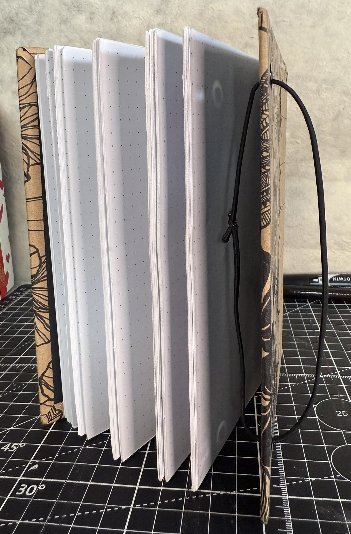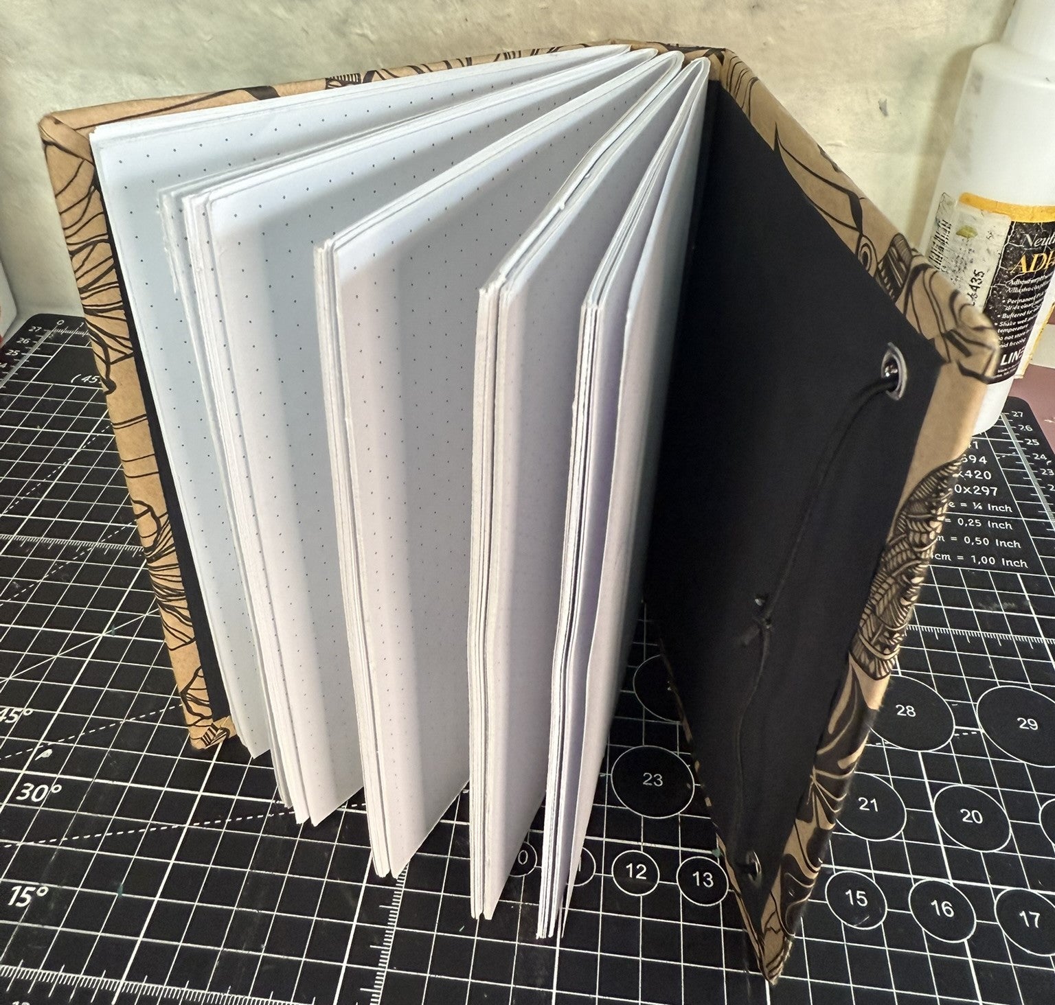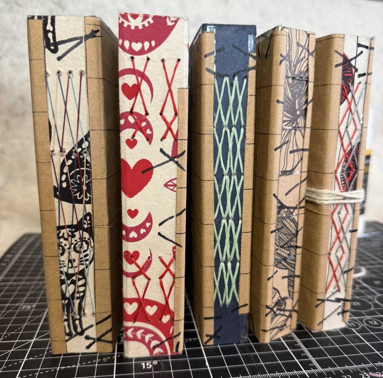 Binding: Hand-stitched link stitch with gradient white-to-black waxed thread