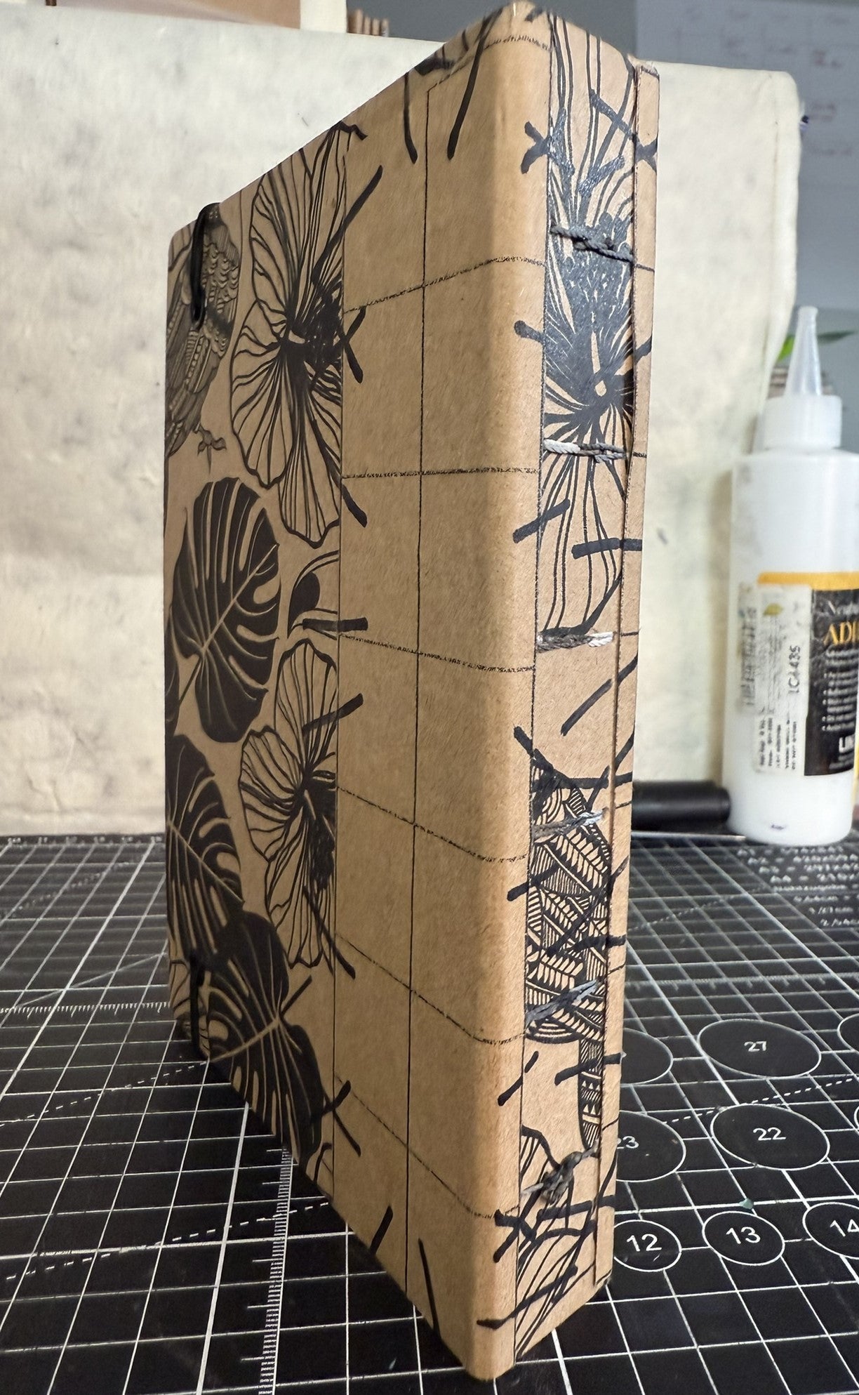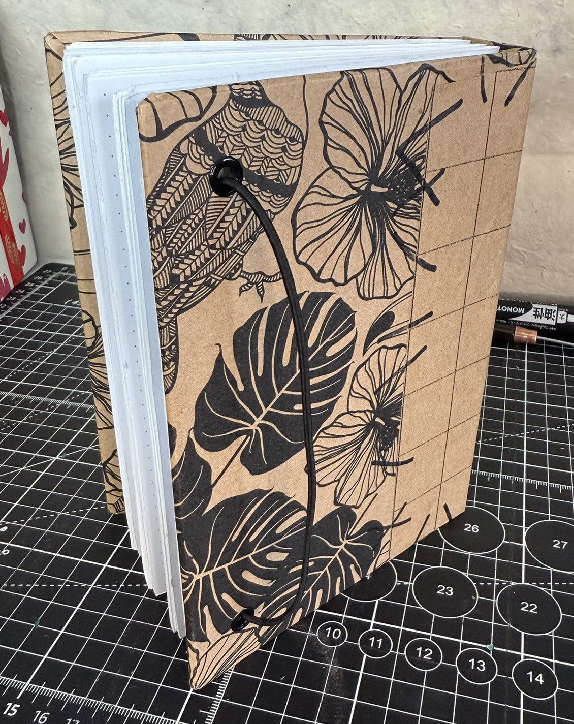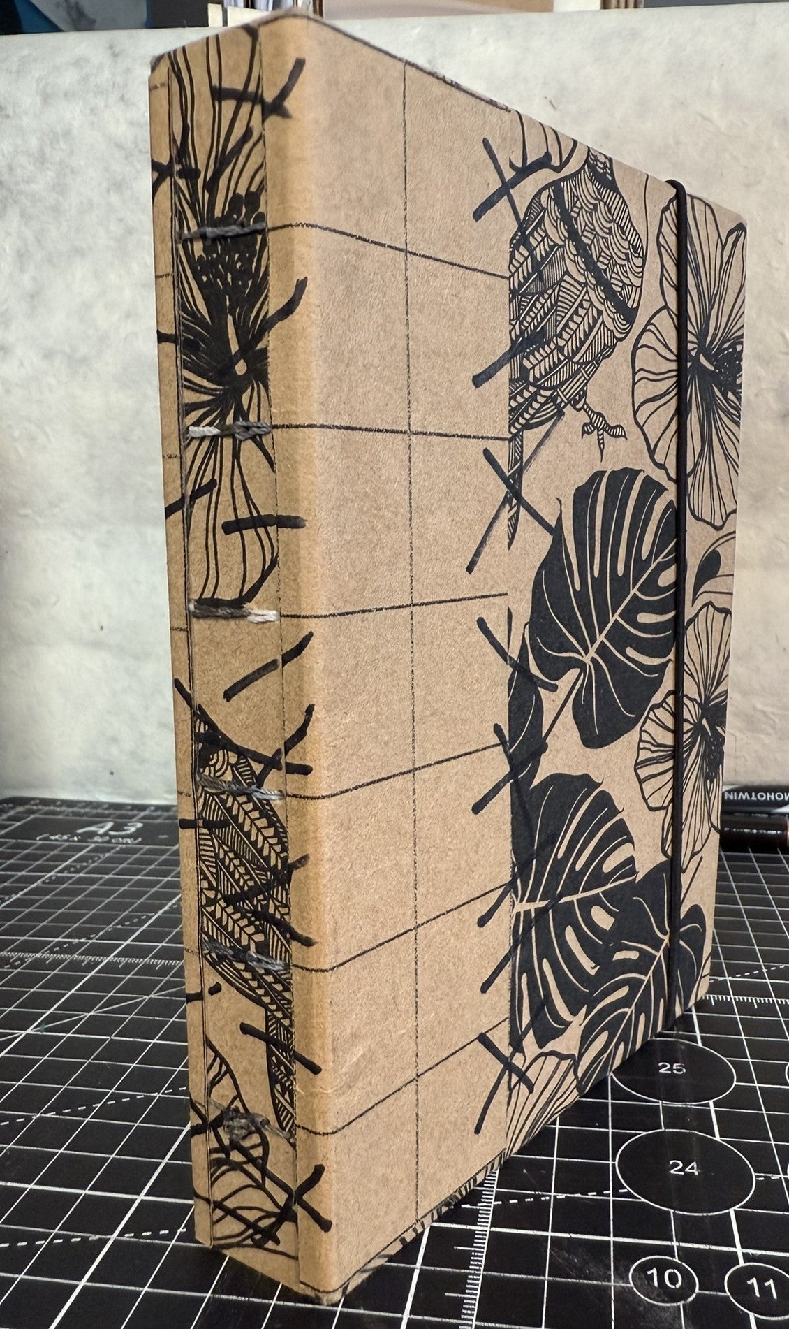 This 5" x 7" handbound journal is wrapped in brown kraft paper printed with black toucans and monstera leaves, reinforced with hand-cut patches for durability and personality.