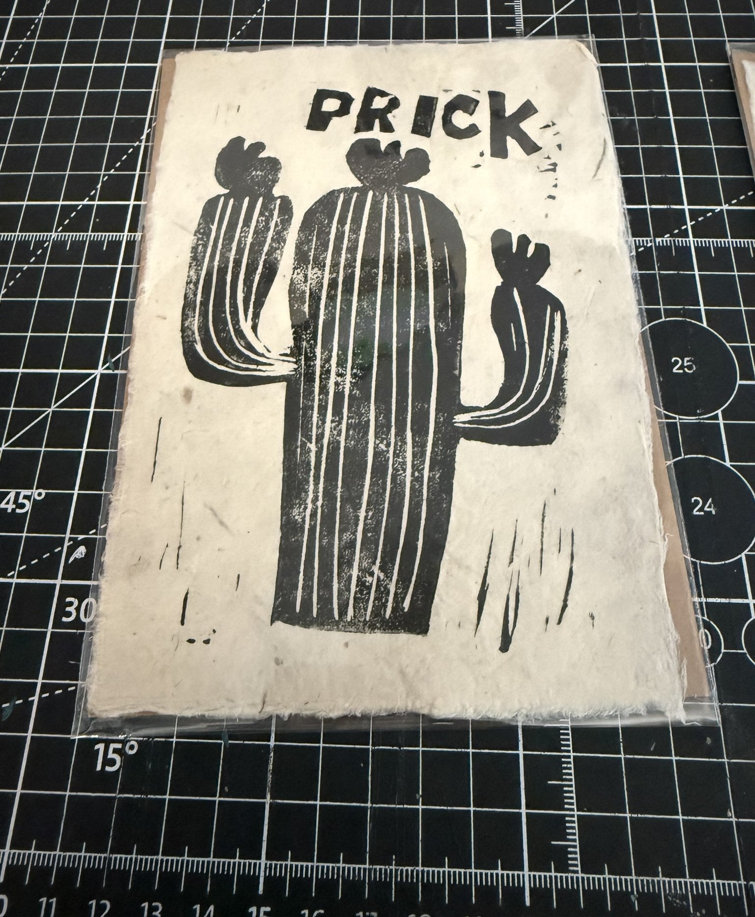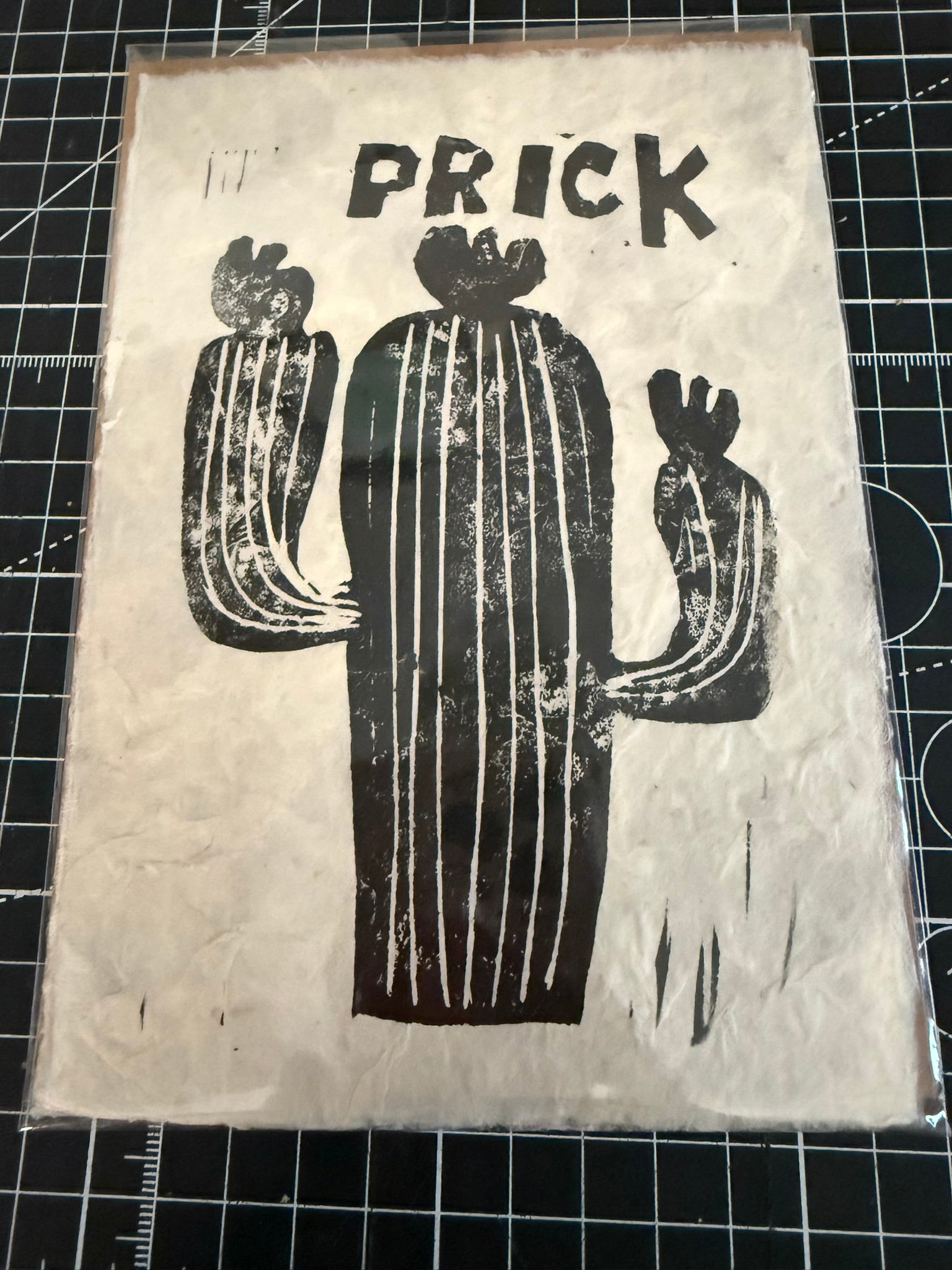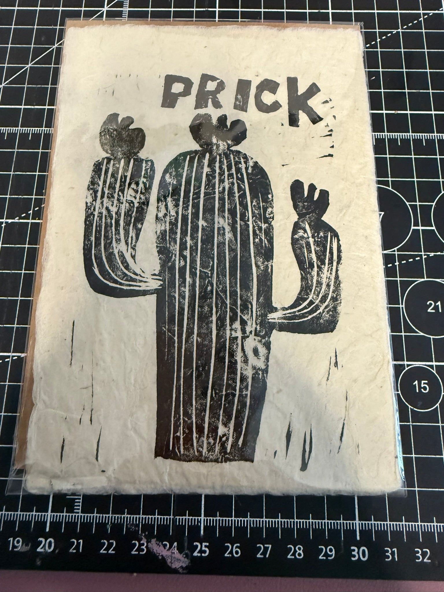 Spiky, small, and a little bit sassy—this cactus wears its label with pride. “PRICK” floats above its proud little posture, and whether you take it literally or with a wink, that’s your business. Hand-carved and printed on 5x7 lokta paper, it makes a great gift for that friend who tells it like it is (or for your own spicy self).