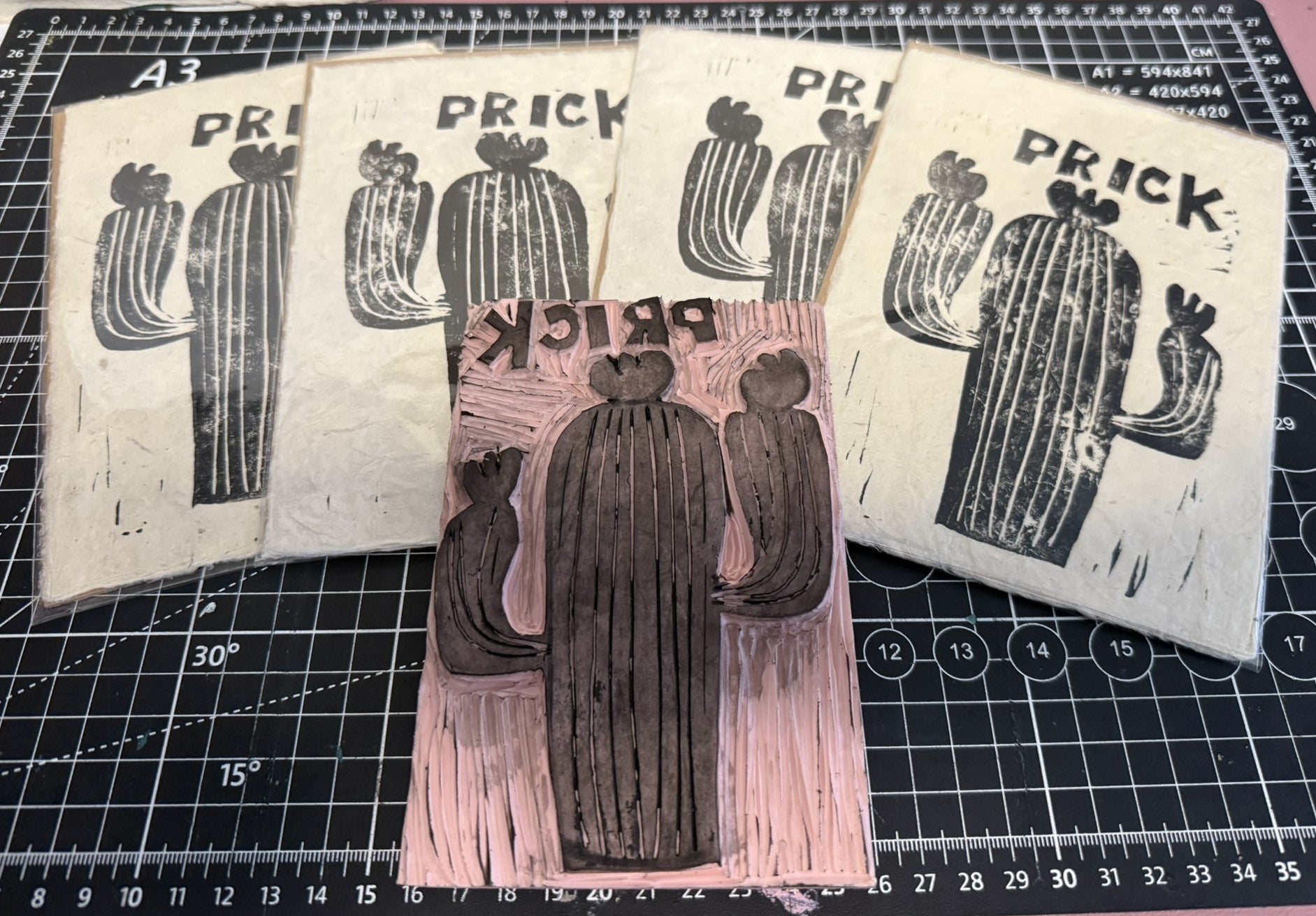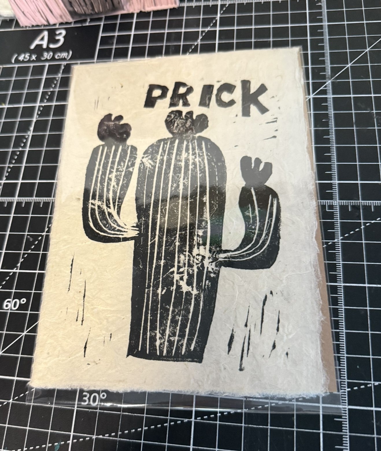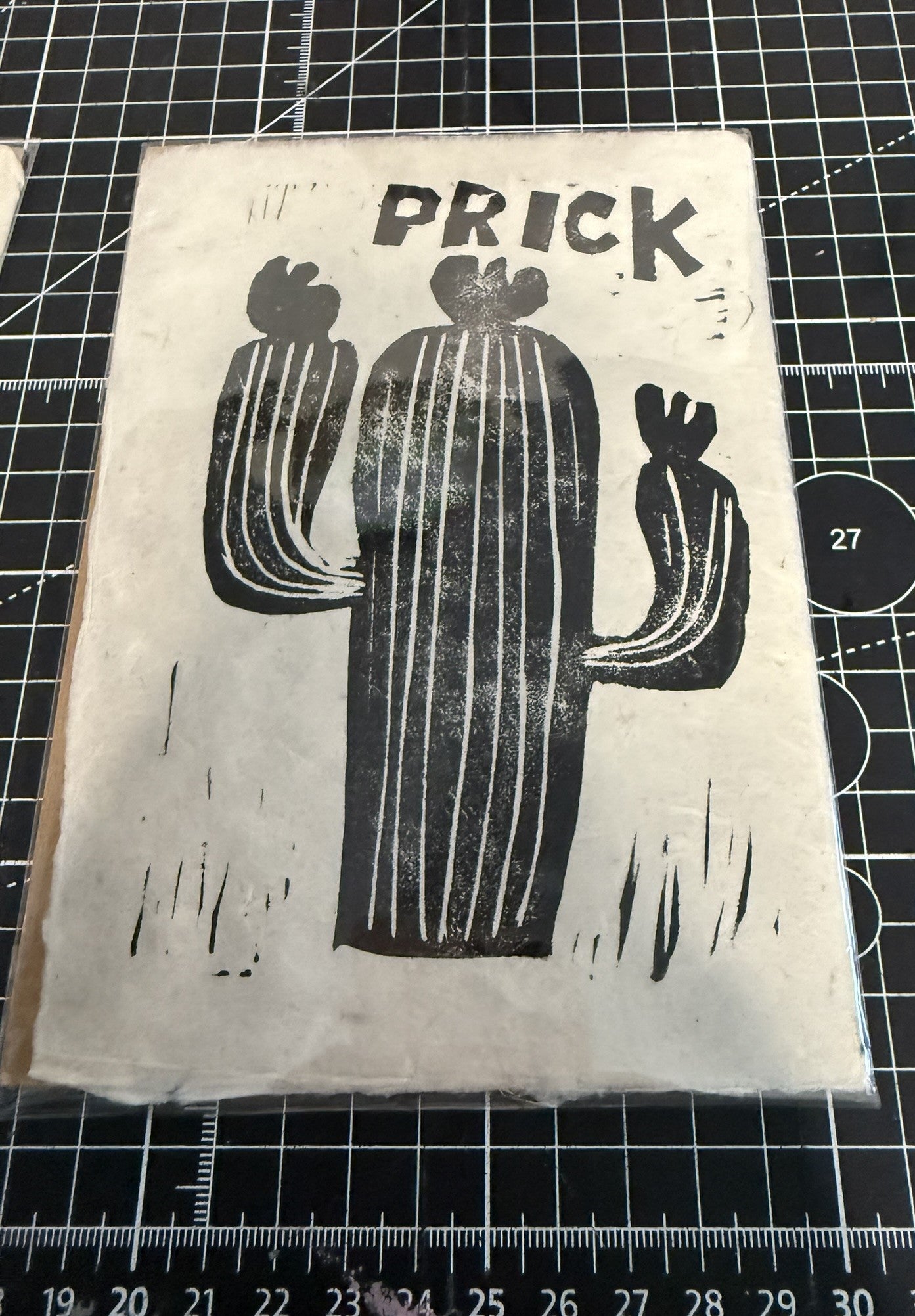 Spiky, small, and a little bit sassy—this cactus wears its label with pride. “PRICK” floats above its proud little posture, and whether you take it literally or with a wink, that’s your business. Hand-carved and printed on 5x7 lokta paper, it makes a great gift for that friend who tells it like it is (or for your own spicy self).