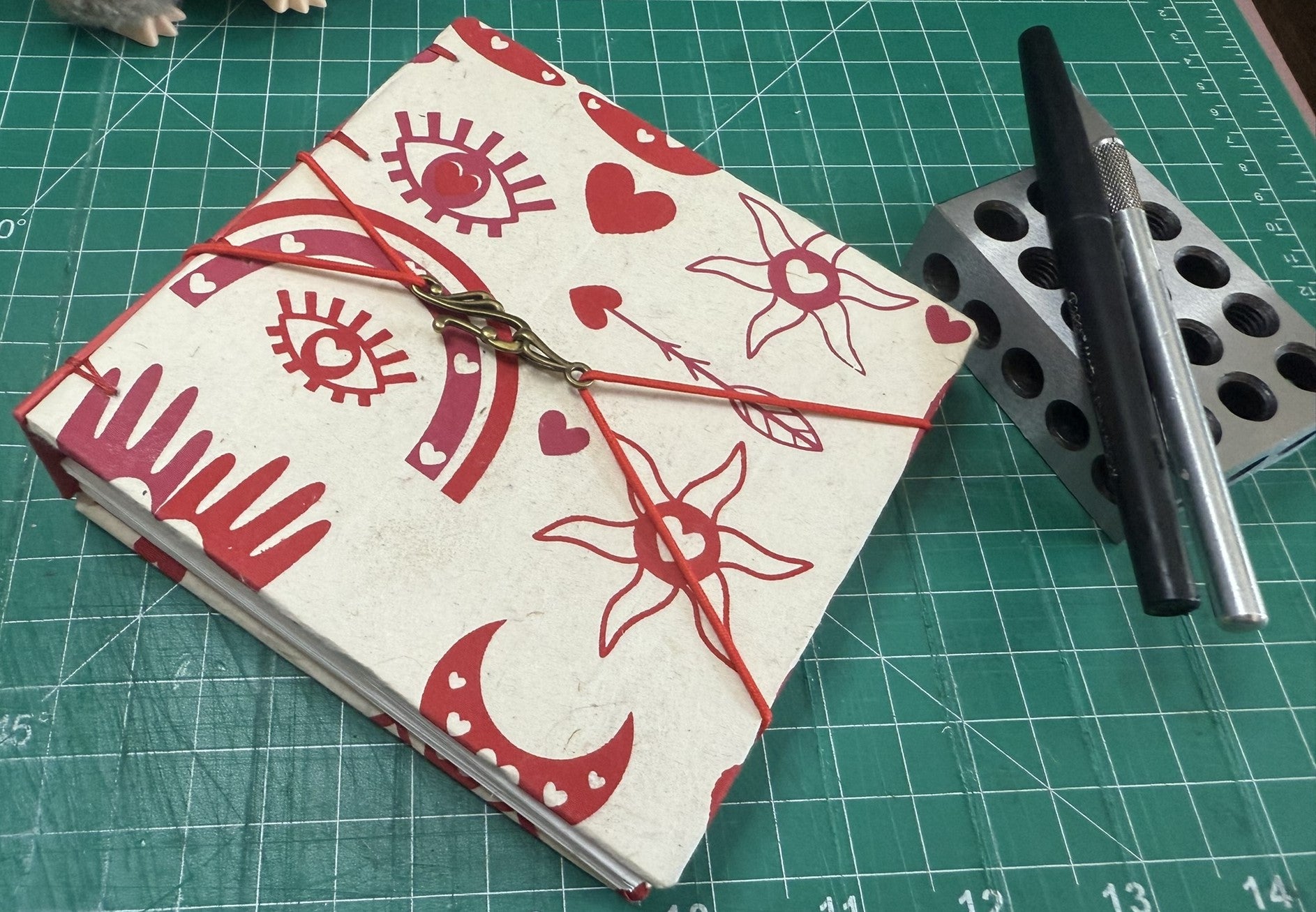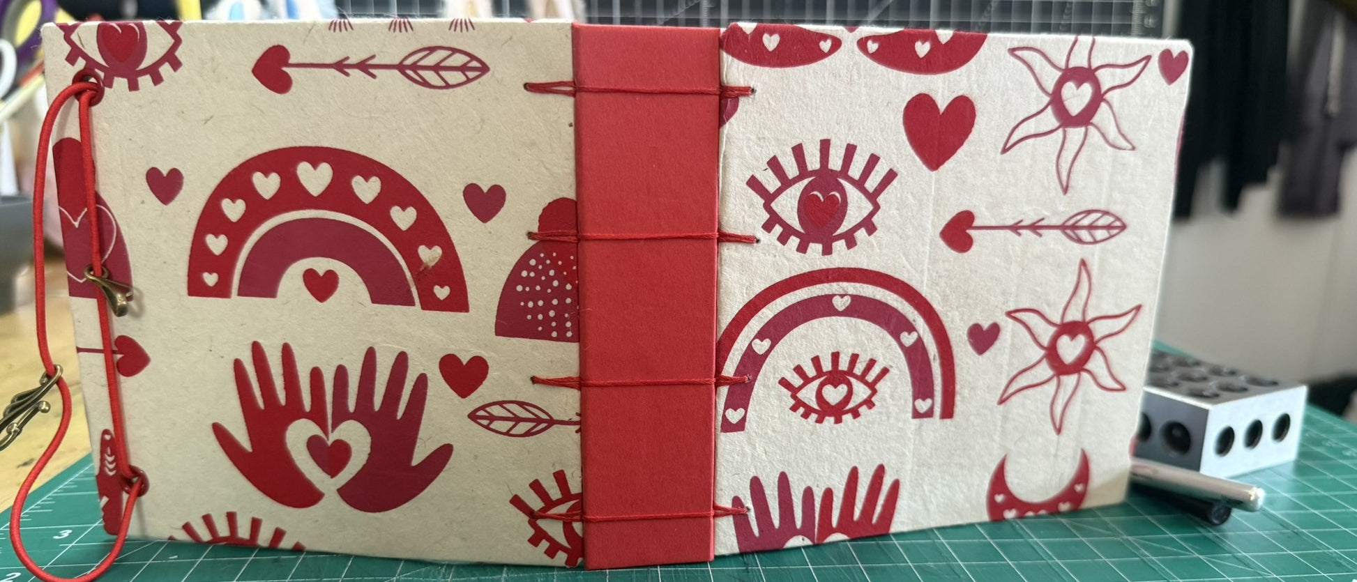 This 5" x 5" handmade journal is wrapped in White lokta paper printed with a red boho motif (hearts, rainbows, arrow, eyes, etc), stitched with red thread using the "secret Belgian" book binding method.