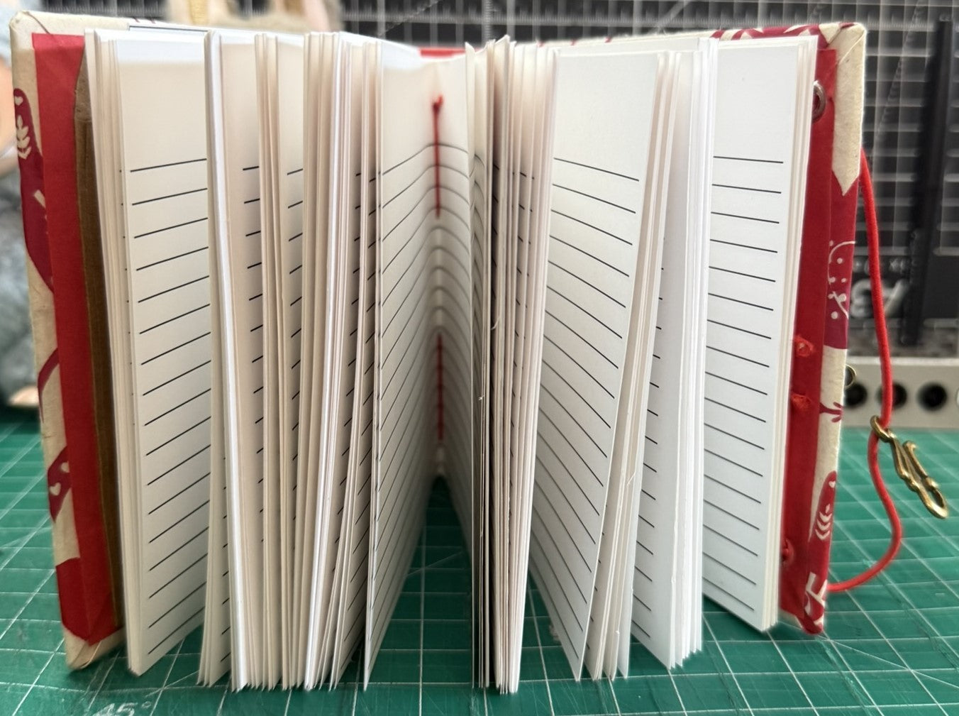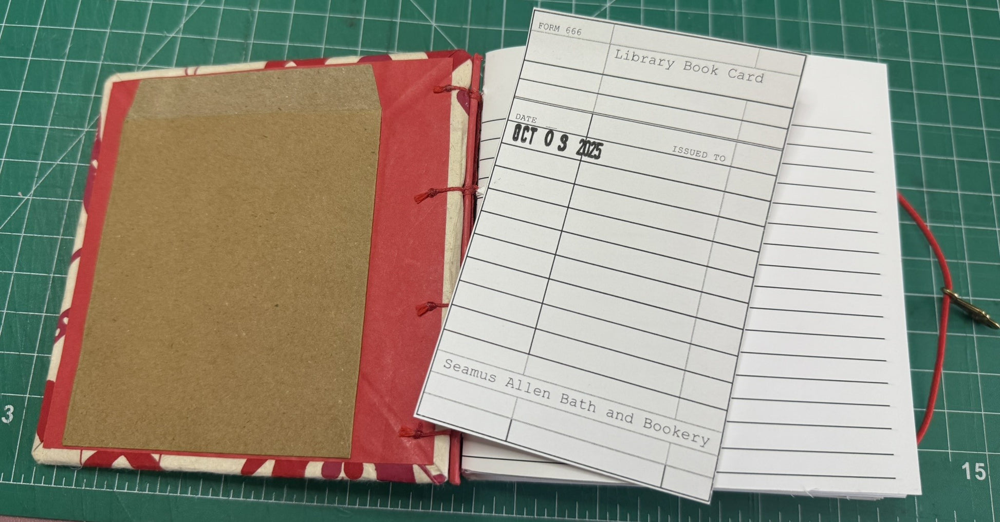 Stained brass hook and ring closure connects, and red elastic keeps everything secure, while inside, red kraft paper lines the covers and 120 hand-printed, acid-free lined pages wait for your notes, sketches, or daily reflections. Finished with a stamped library card pocket marking the date this book was made.
