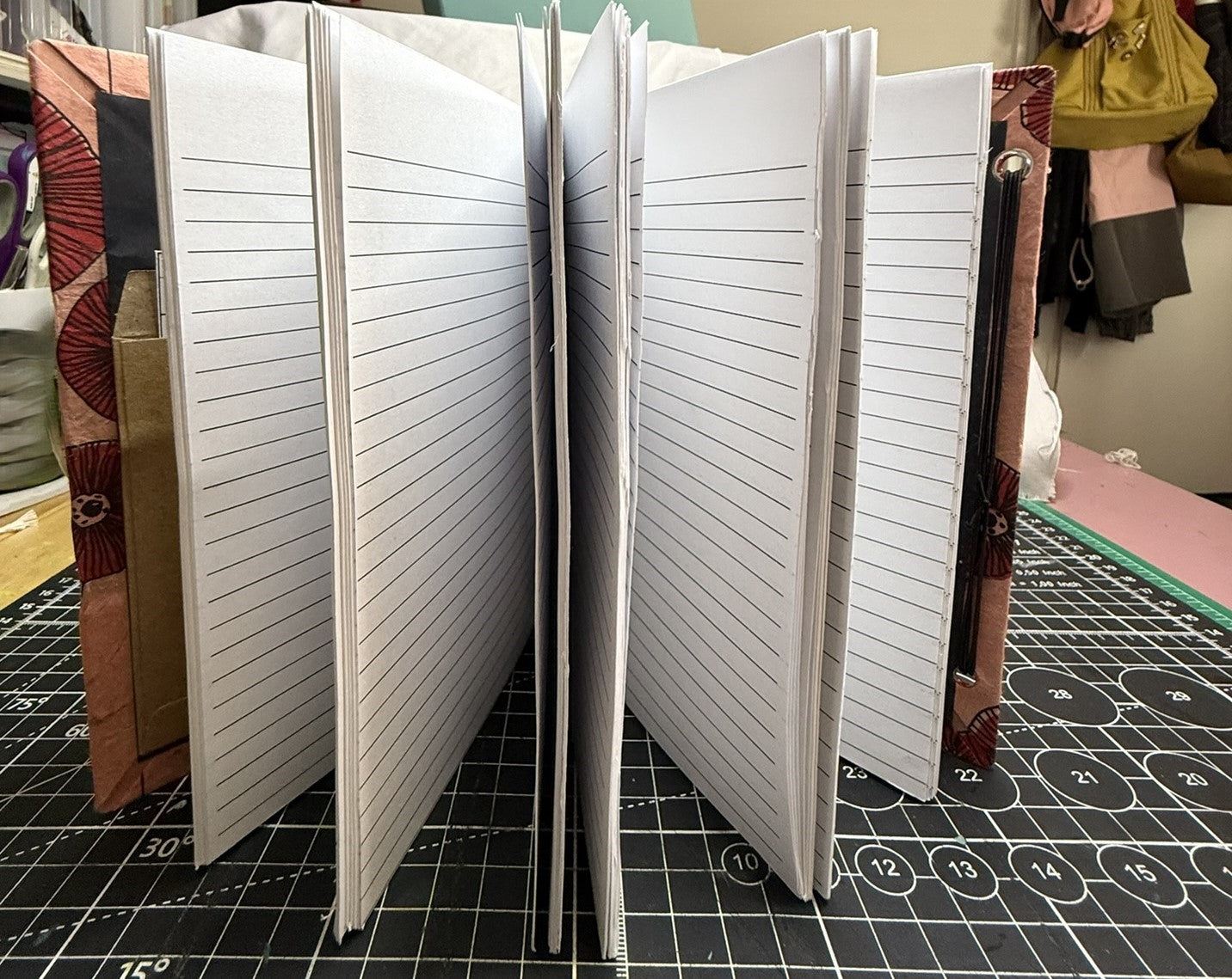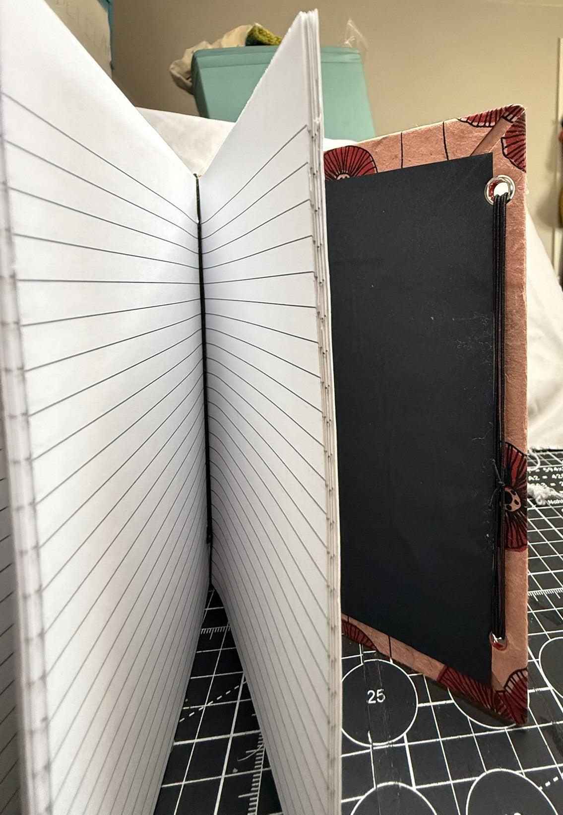 This 5" x 7" handmade journal is wrapped in pink lokta paper printed with red and black poppies, stitched with red and black thread in a long stitch variation.