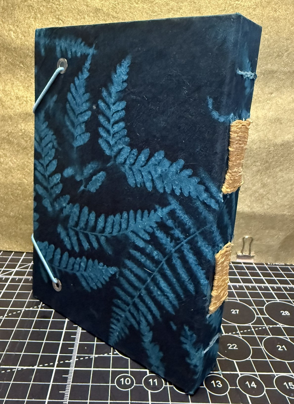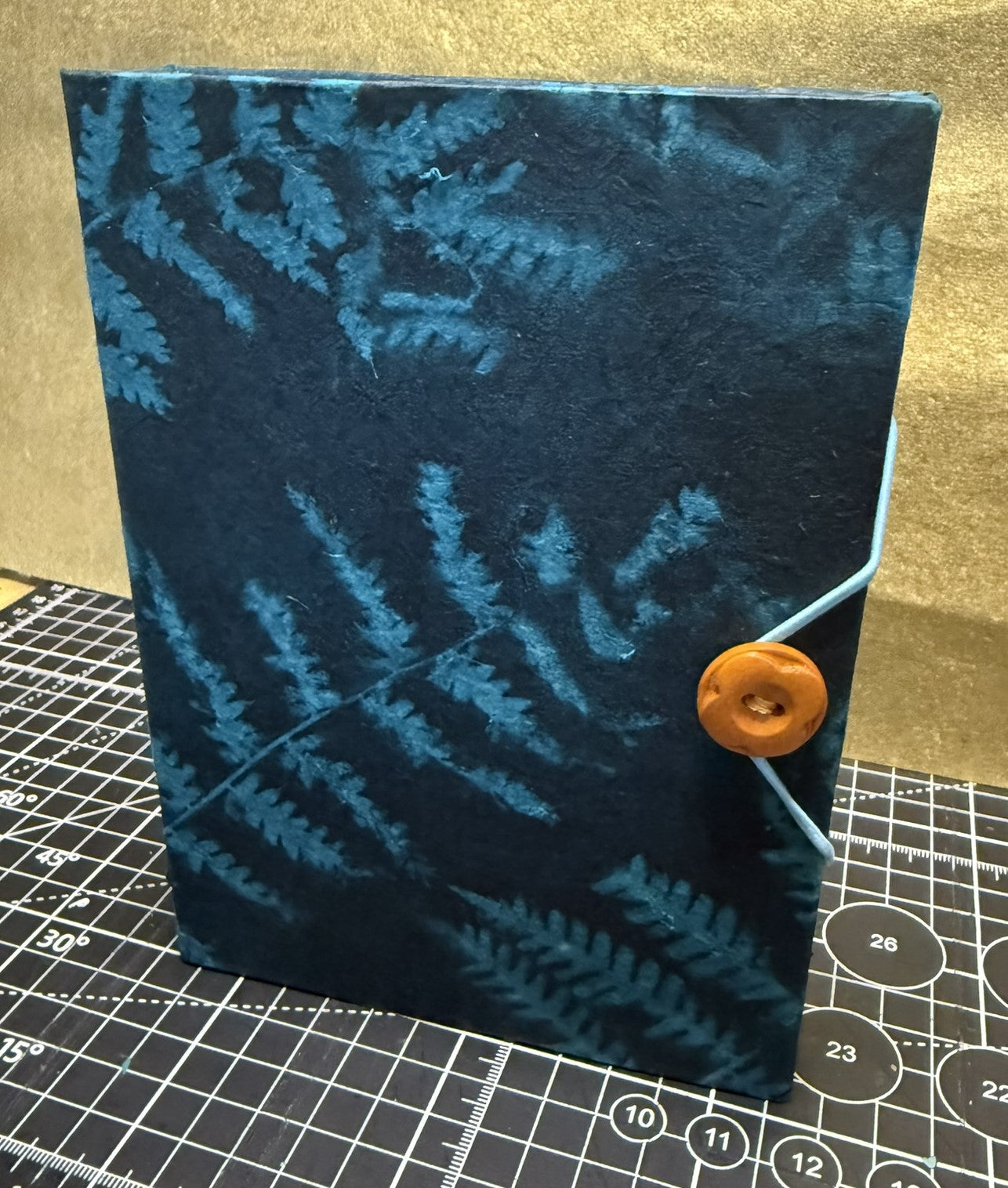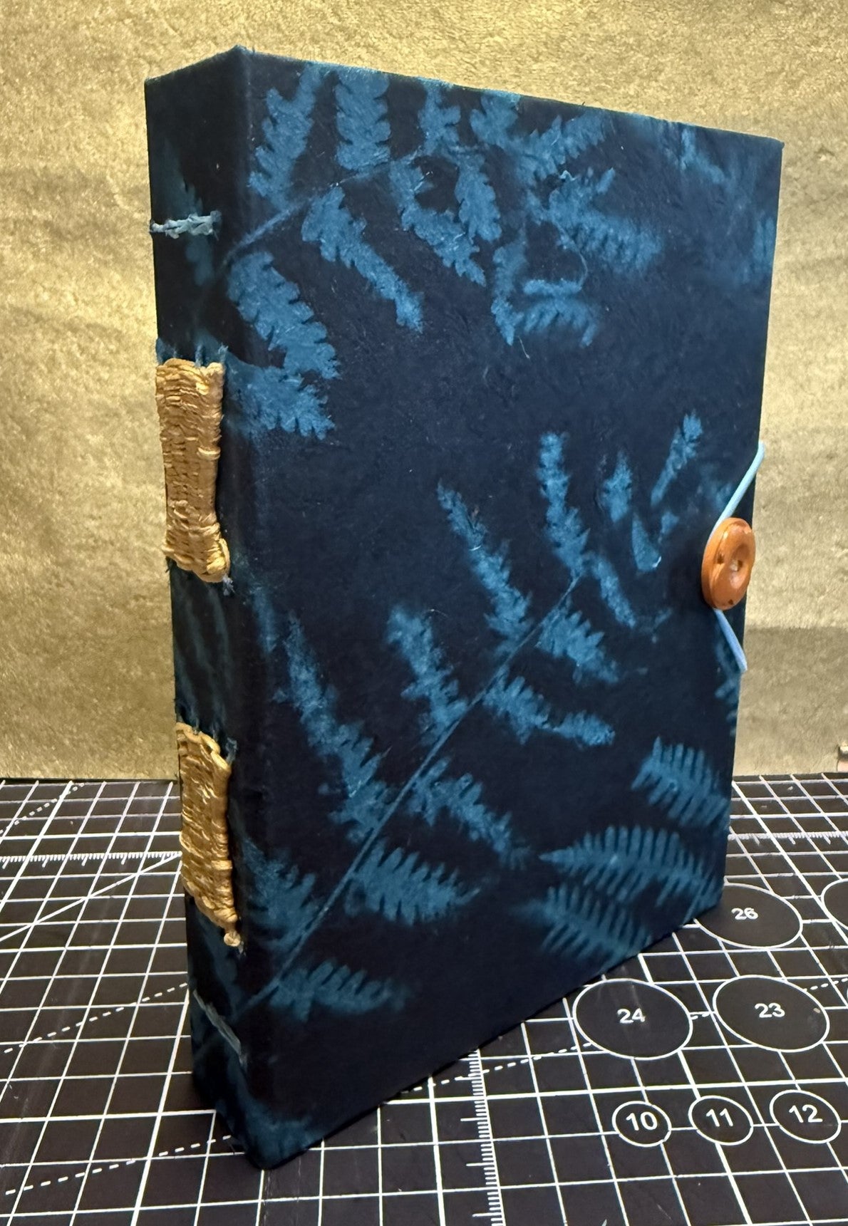 This 5" x 7" journal is wrapped in bright blue lokta paper, sunbleached with delicate fern imprints. Inside, 96 dot-grid pages are stitched with matching waxed thread, while a bold orange thread weaves through the long-stitch binding for a touch of intricate detail.