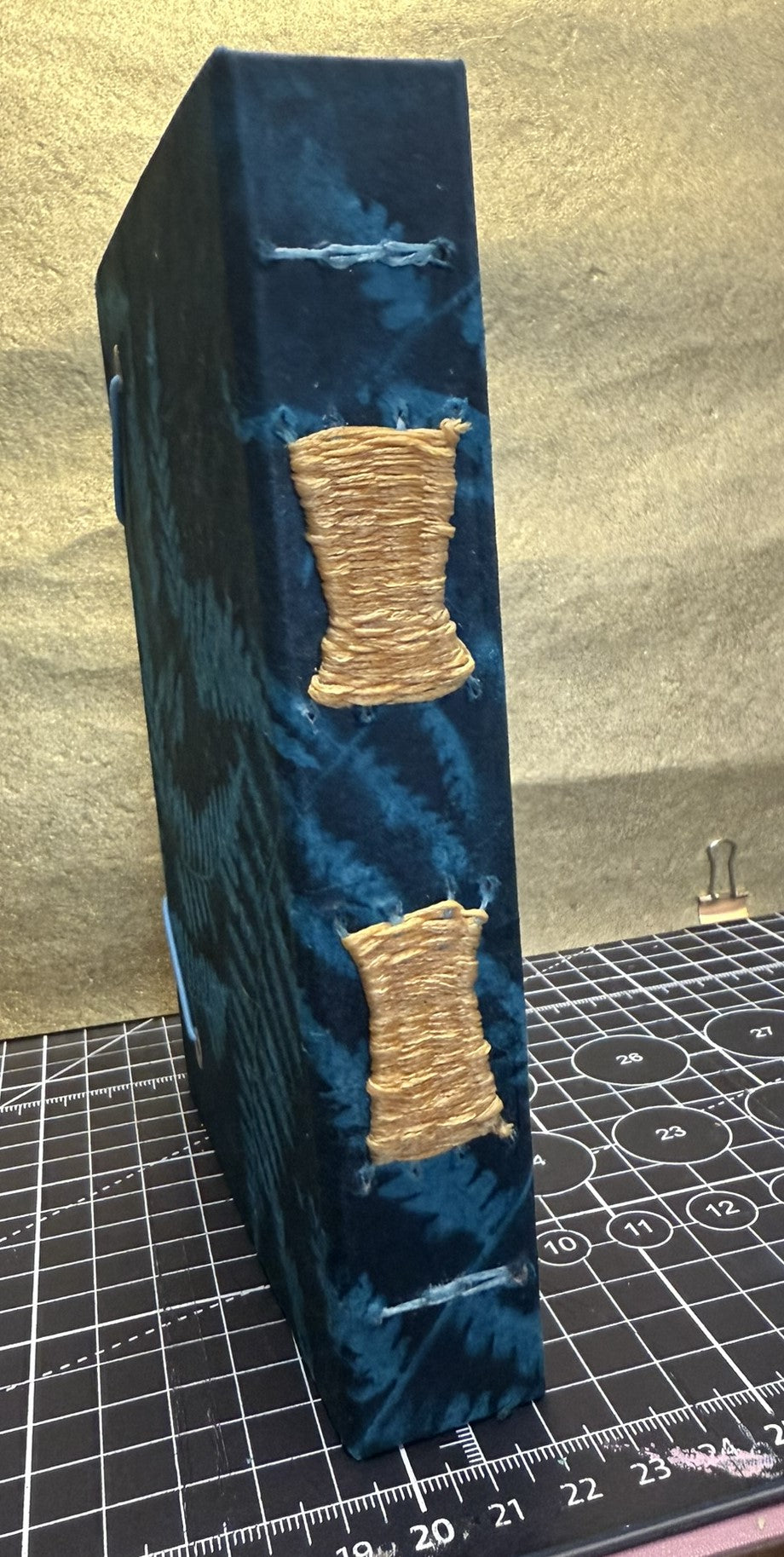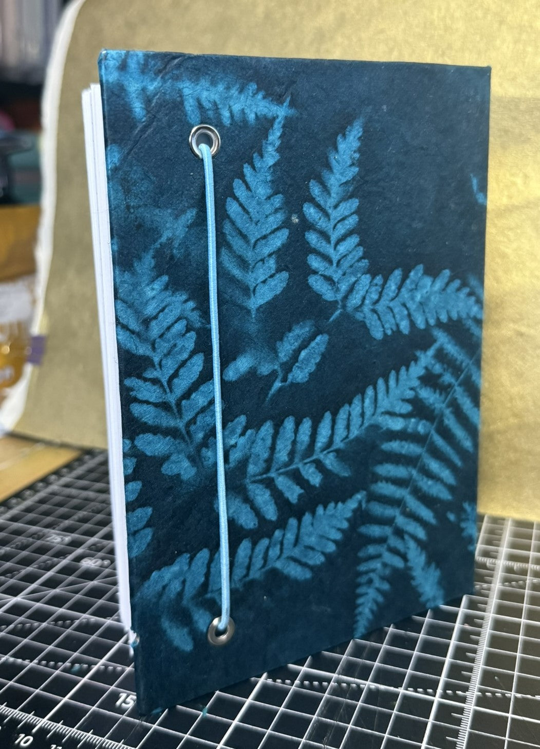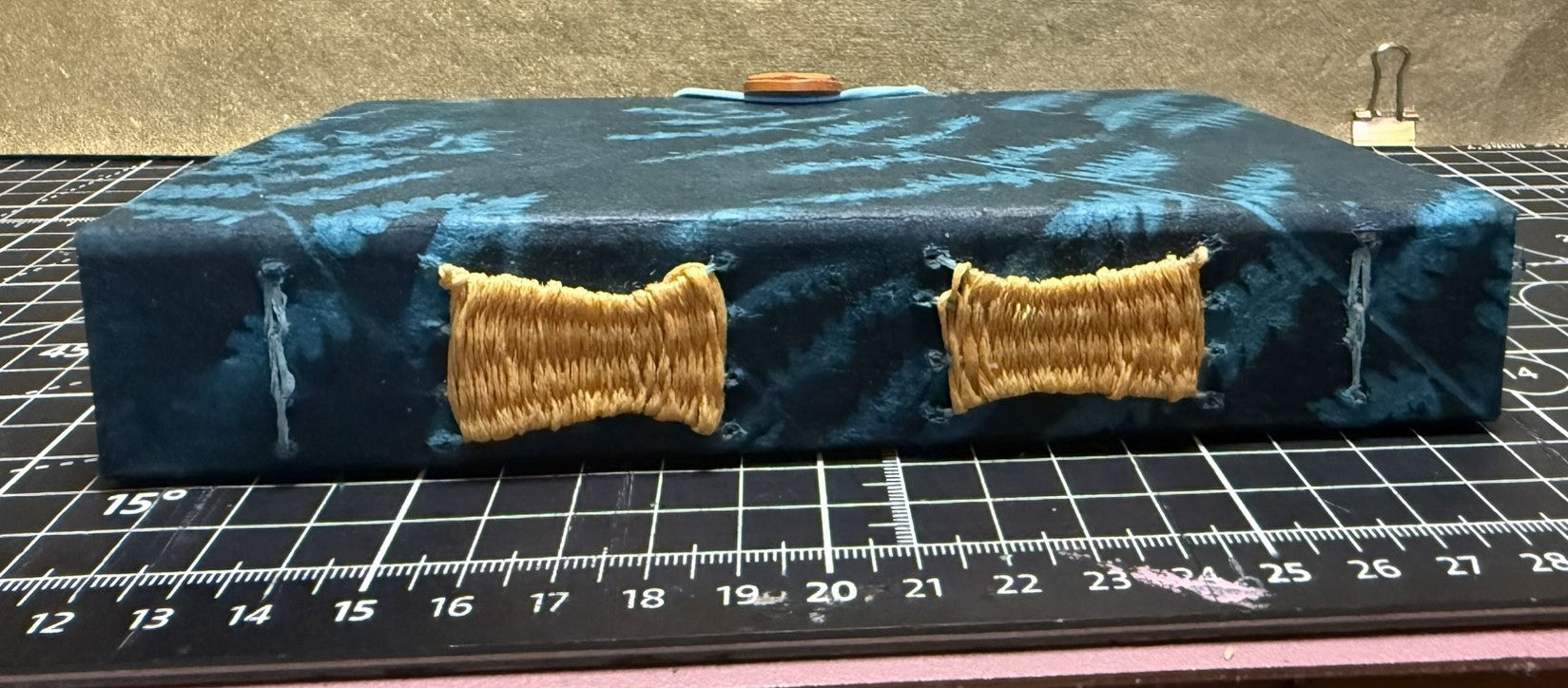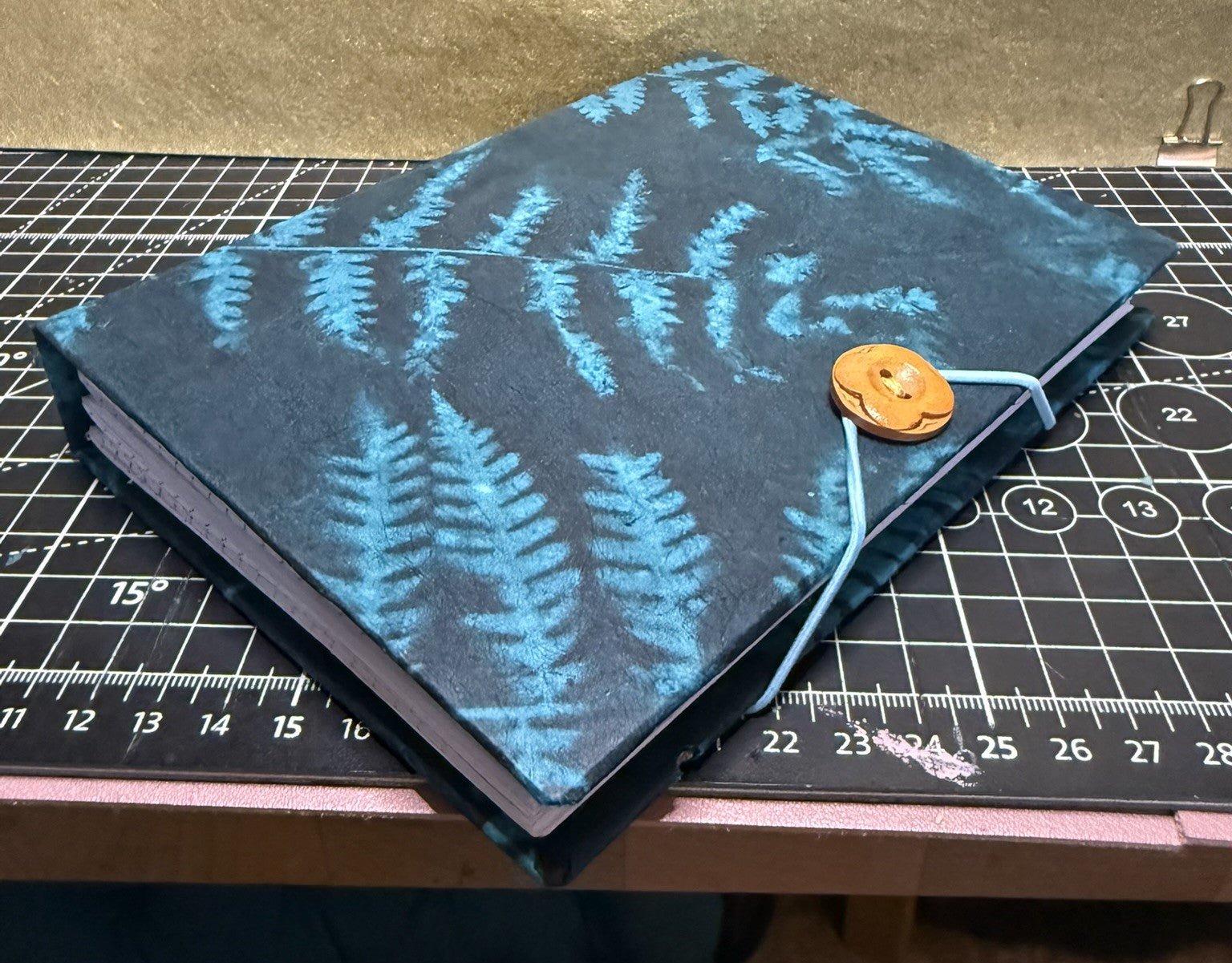 This 5" x 7" journal is wrapped in bright blue lokta paper, sunbleached with delicate fern imprints. Inside, 96 dot-grid pages are stitched with matching waxed thread, while a bold orange thread weaves through the long-stitch binding for a touch of intricate detail.