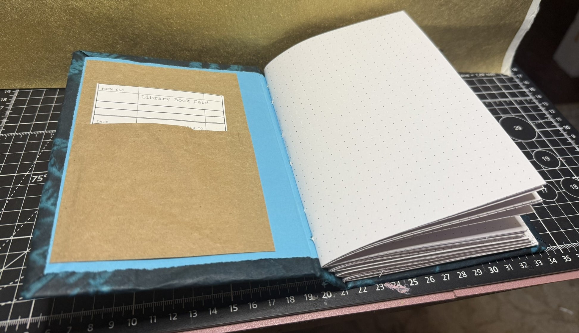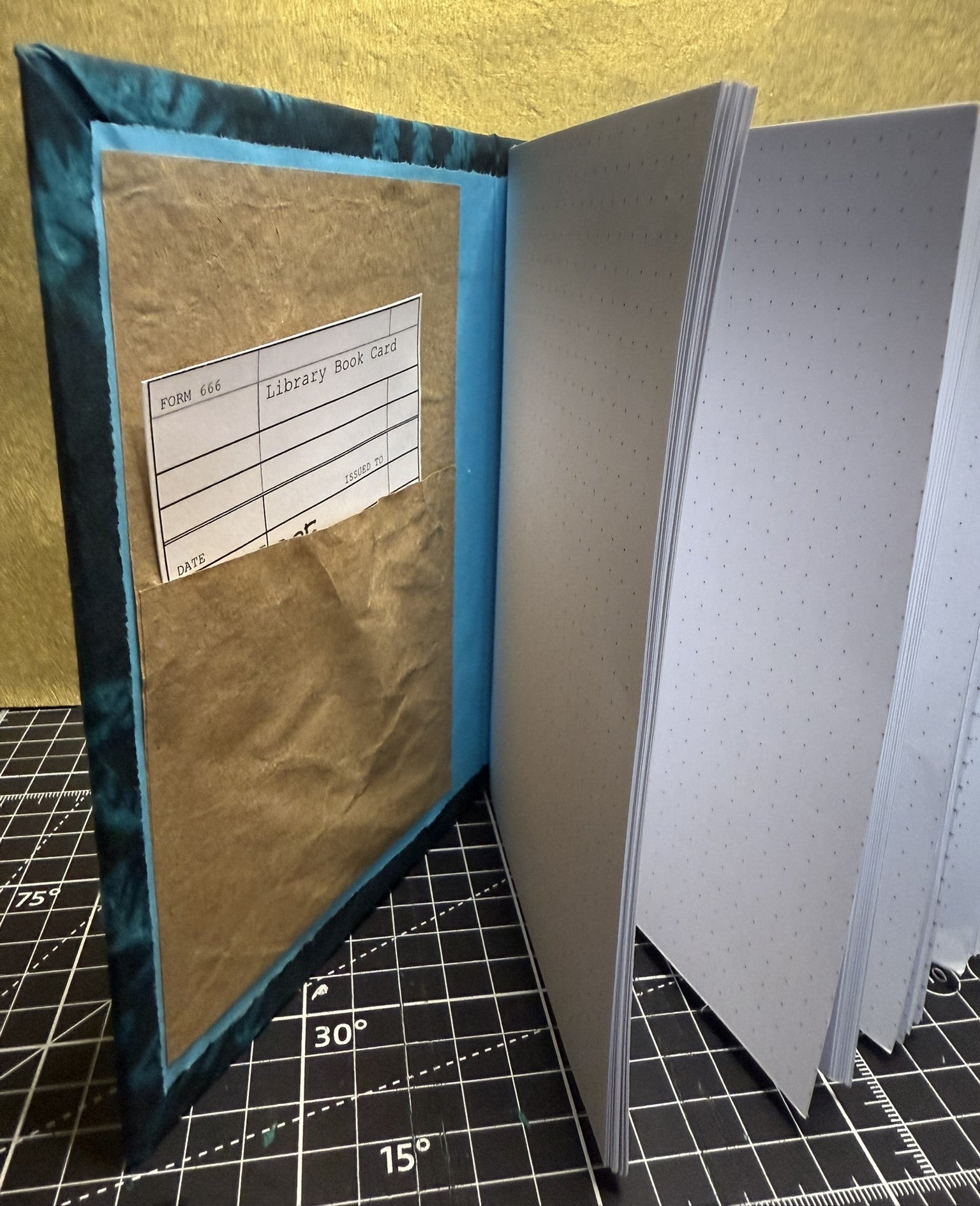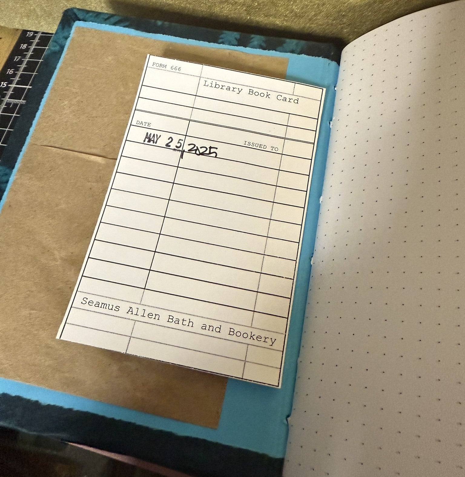 A front pocket holds a stamped library card with the date this book was completed, and a ribbon closure threaded through grommets and anchored by a button keeps everything secure.