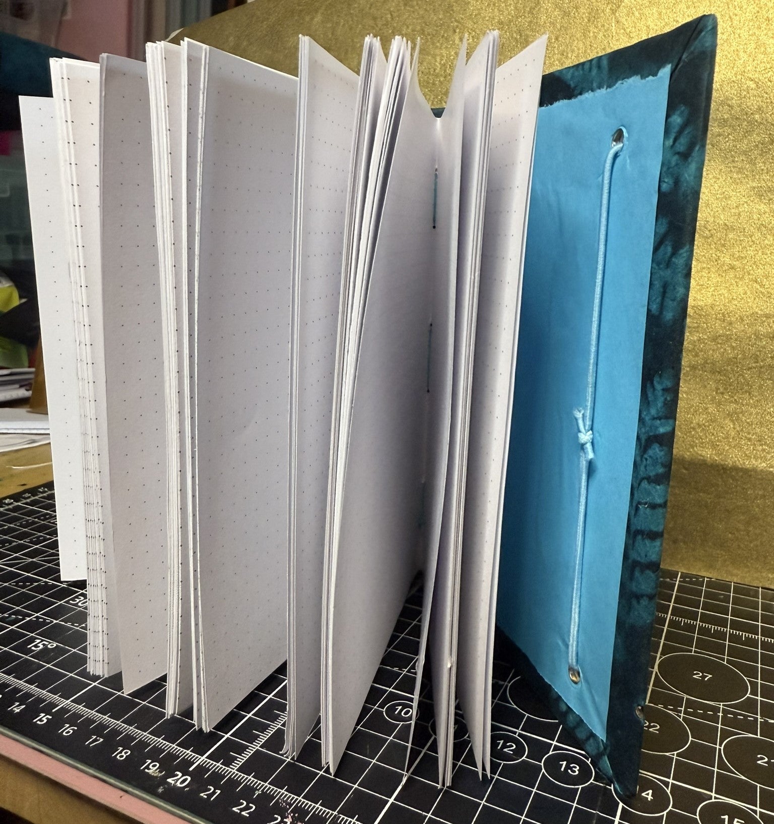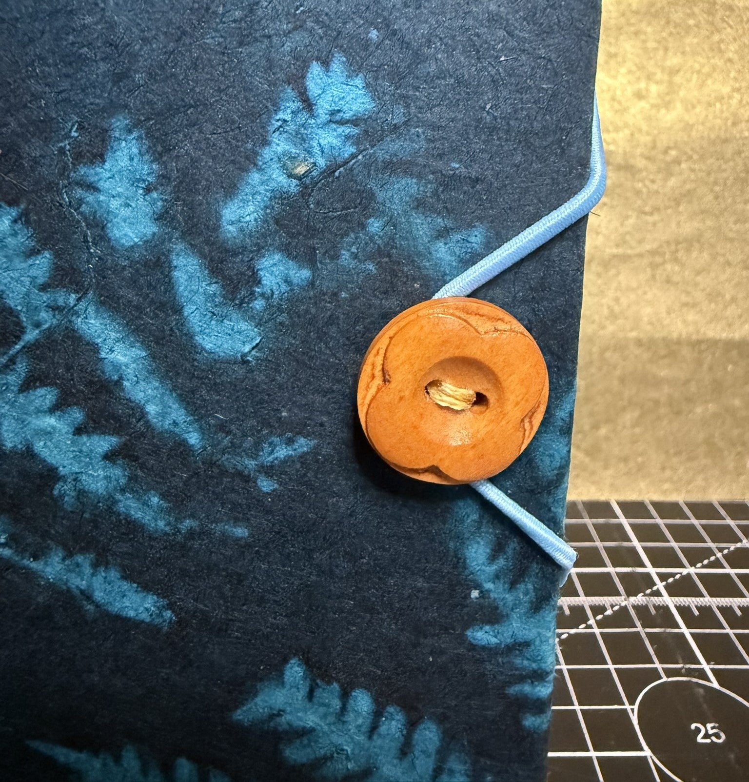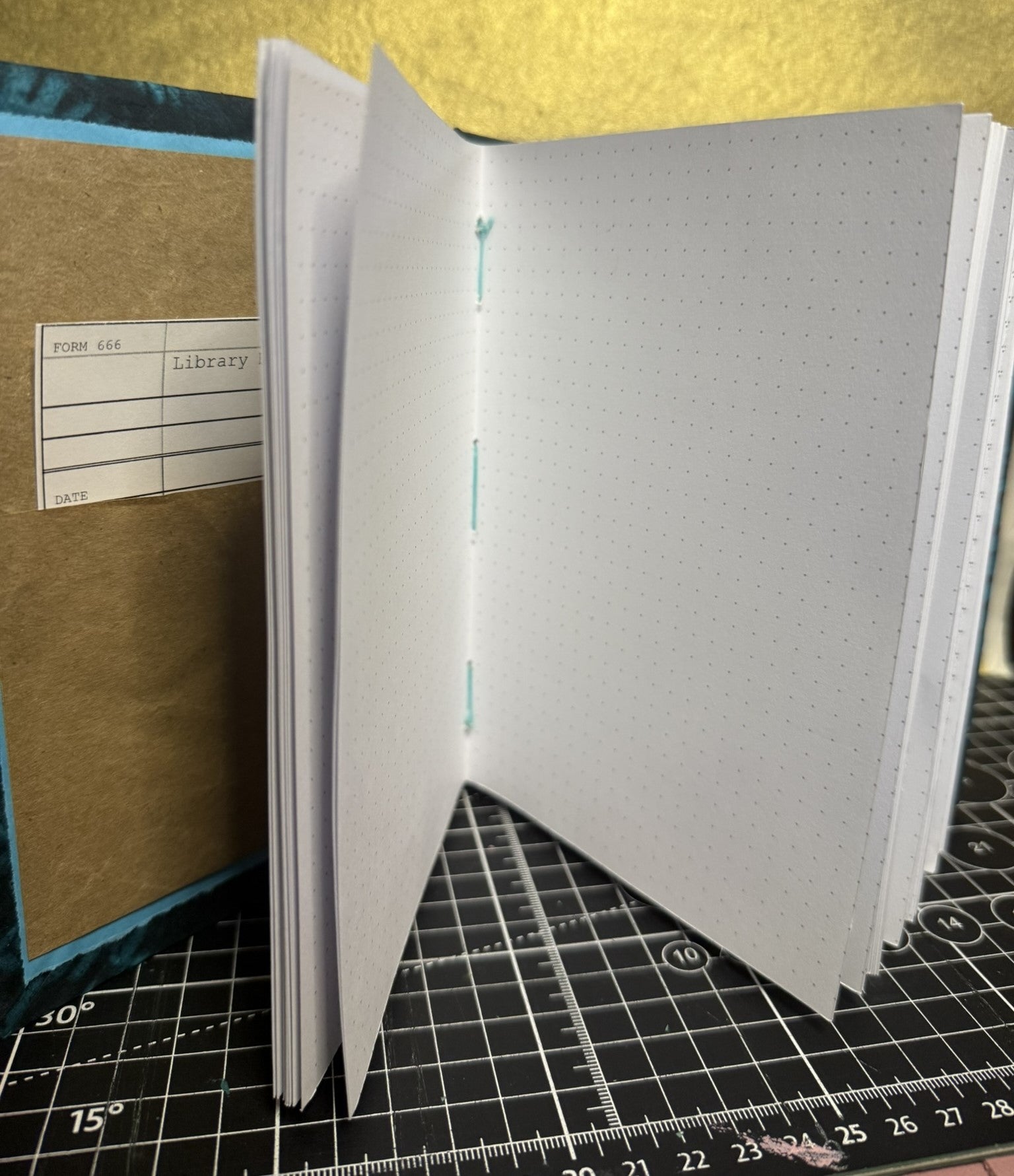 A front pocket holds a stamped library card with the date this book was completed, and a ribbon closure threaded through grommets and anchored by a button keeps everything secure.