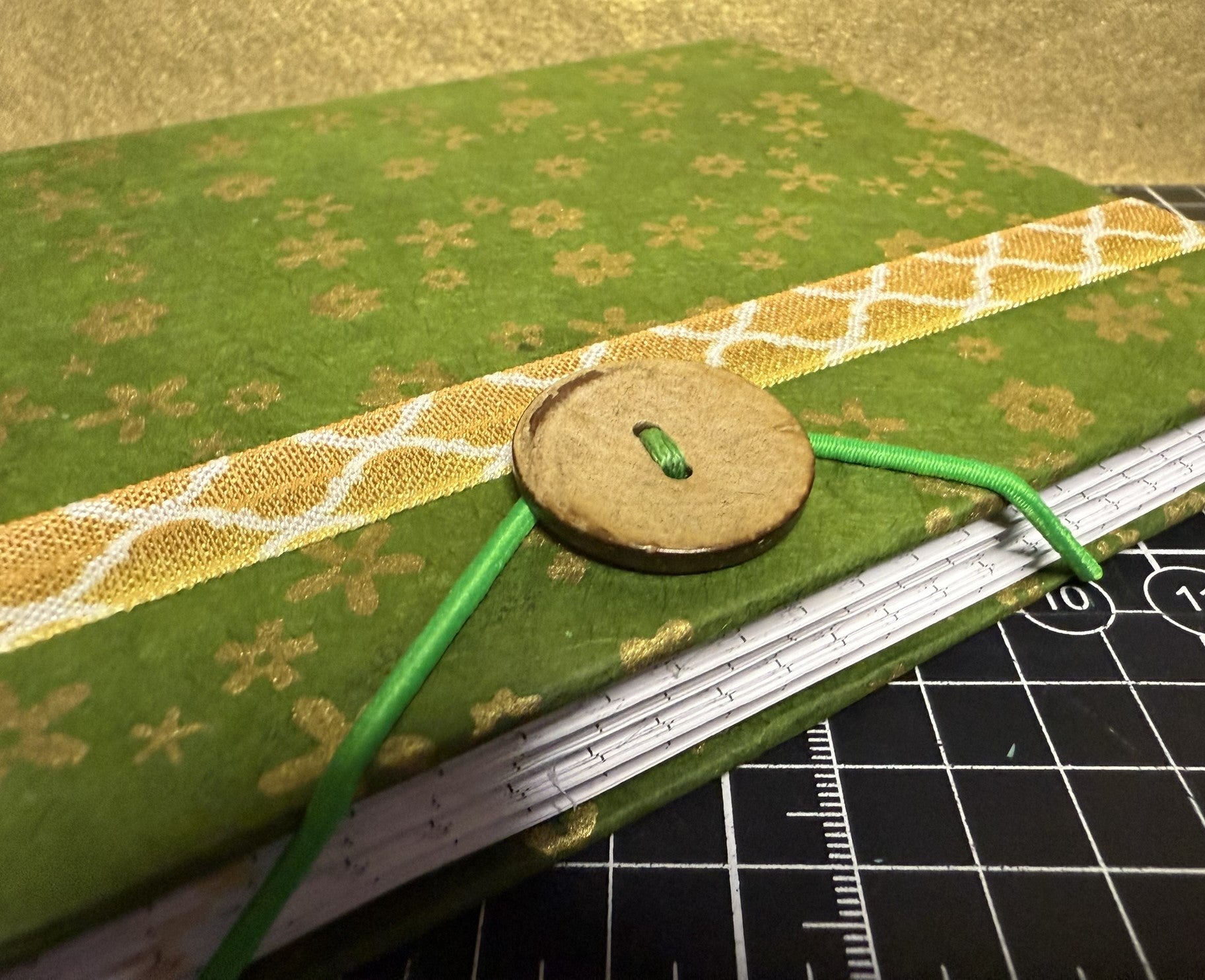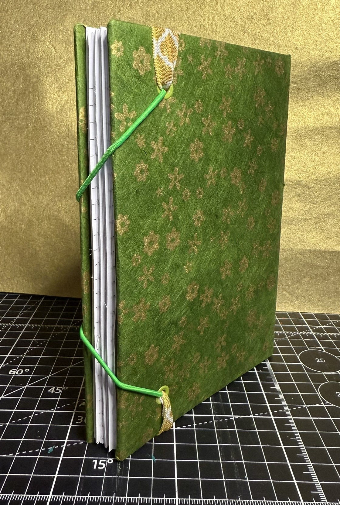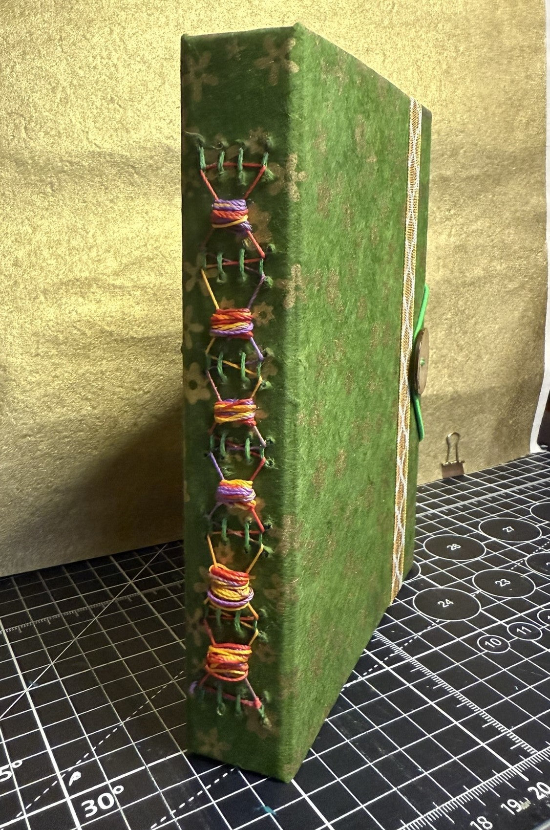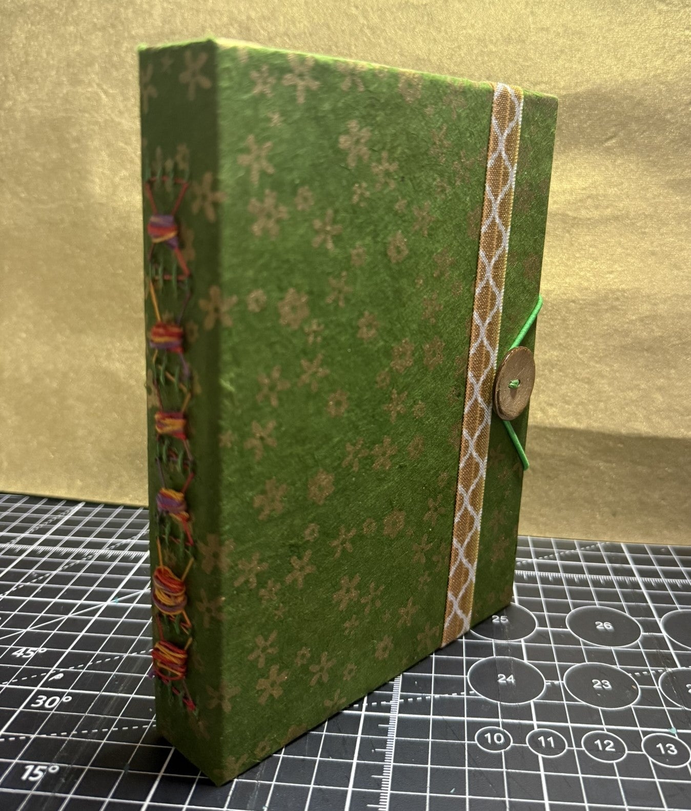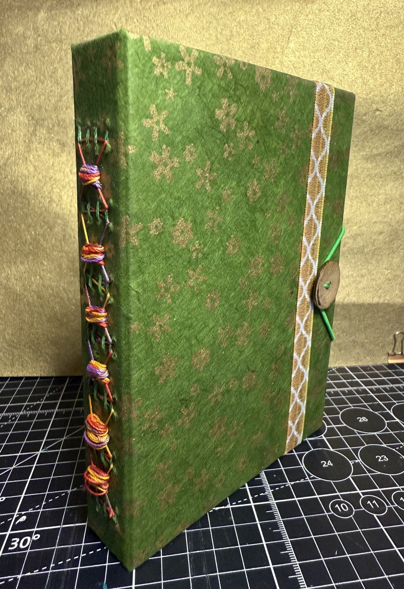 This journal is wrapped in green lokta paper with gold daisy motifs and lined with thick, luminous gold lokta inside. Signatures are stitched in green waxed thread, accented with red-to-purple gradient X patterns that are wound and wrapped for extra texture. Two ribbons — one thick and gold, one bright green — are looped through the back. Use either to keep it shut or save your page. A natural coconut shell button anchors the front. A hand-stamped library card inside marks the date this book was completed.