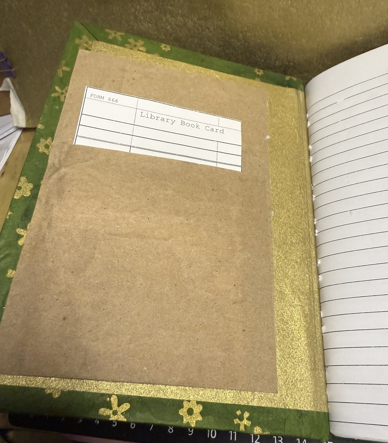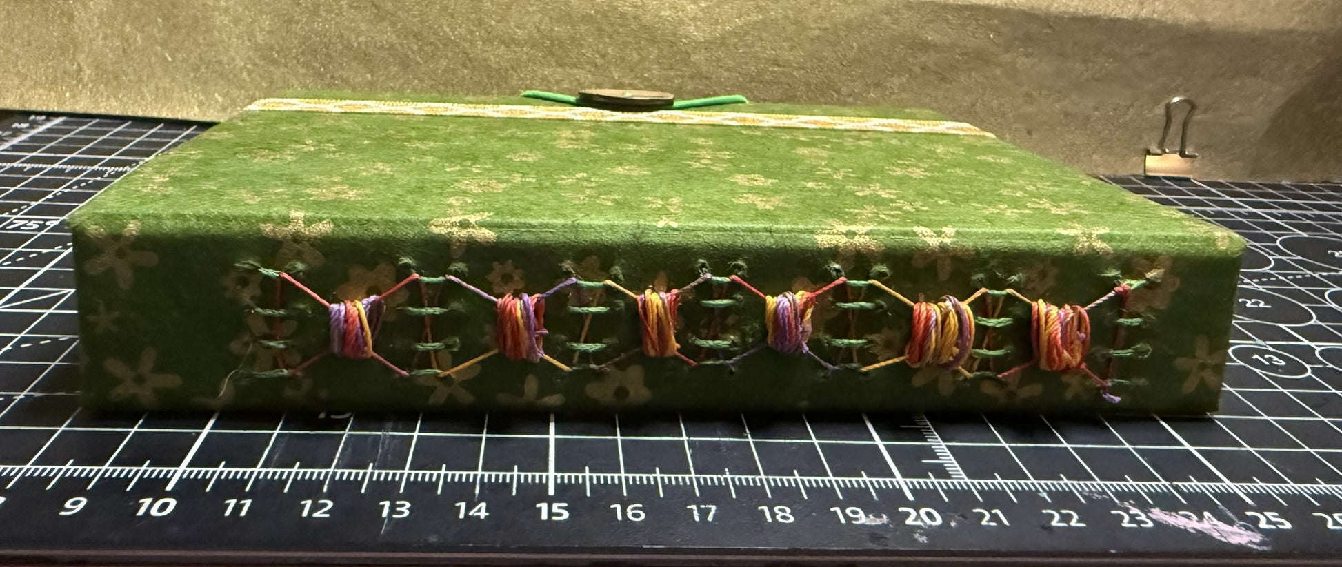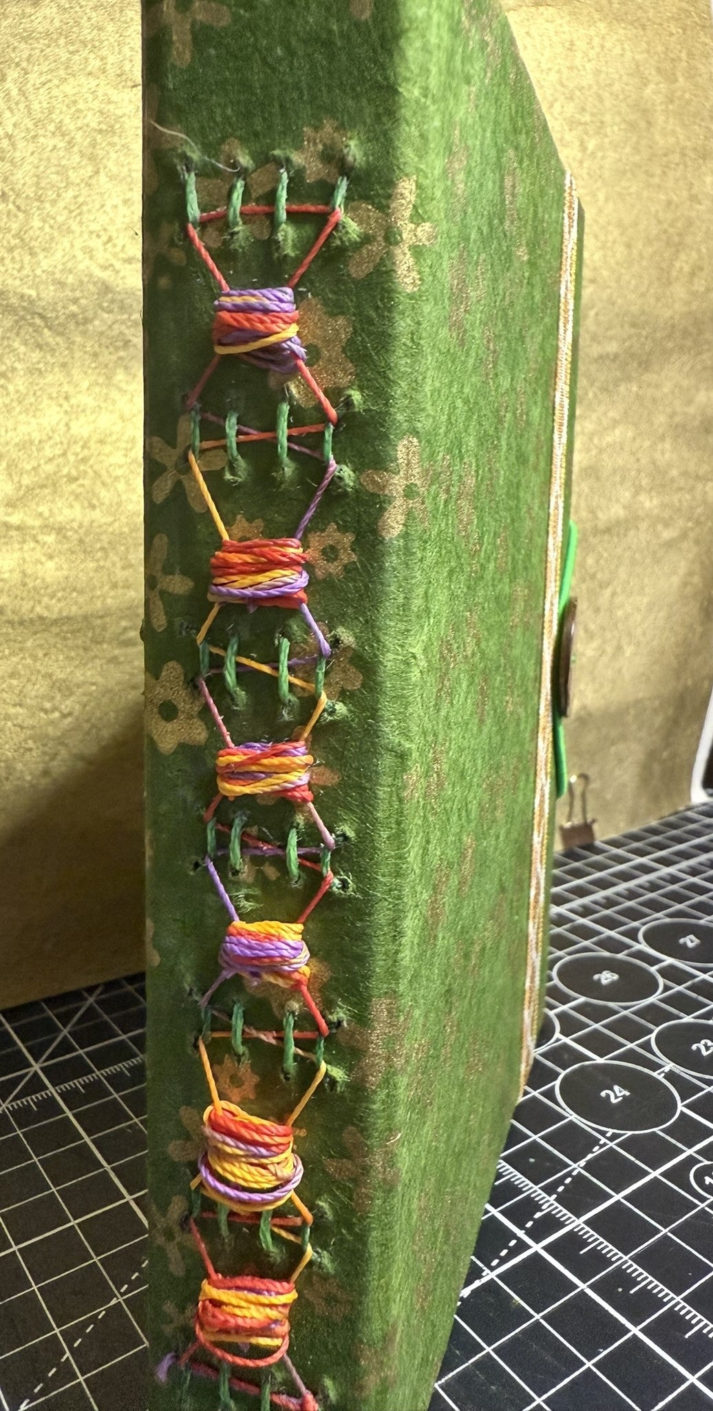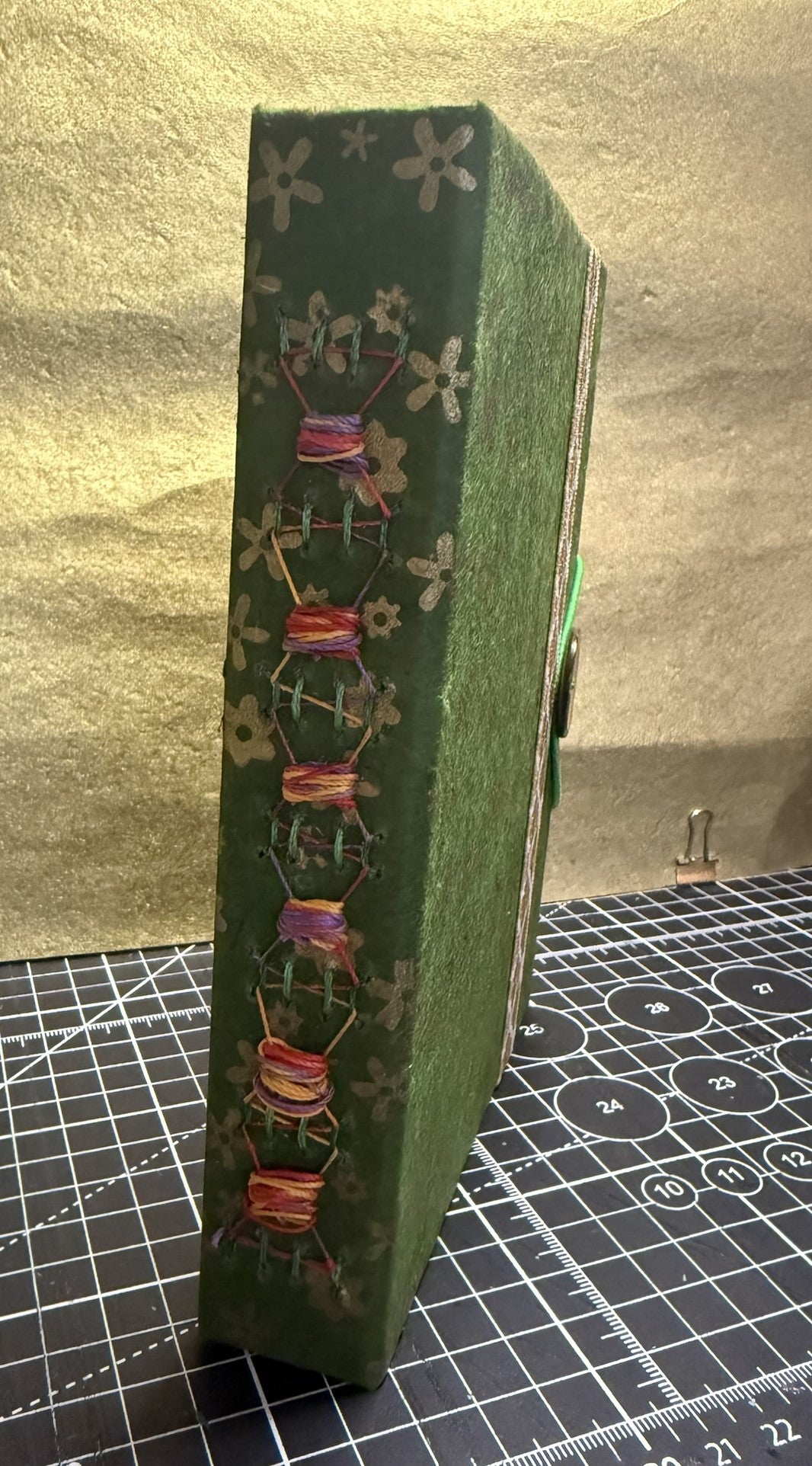 This journal is wrapped in green lokta paper with gold daisy motifs and lined with thick, luminous gold lokta inside. Signatures are stitched in green waxed thread, accented with red-to-purple gradient X patterns that are wound and wrapped for extra texture. Two ribbons — one thick and gold, one bright green — are looped through the back. Use either to keep it shut or save your page. A natural coconut shell button anchors the front. A hand-stamped library card inside marks the date this book was completed.