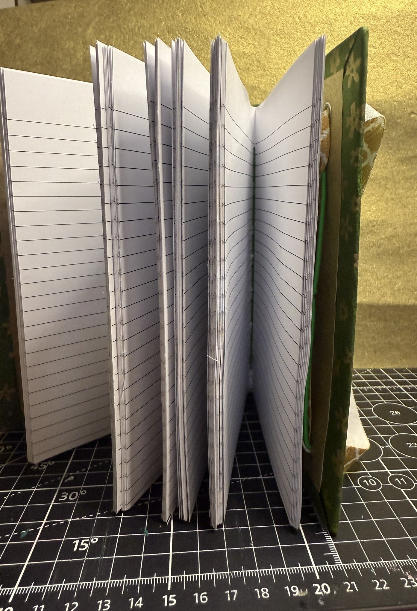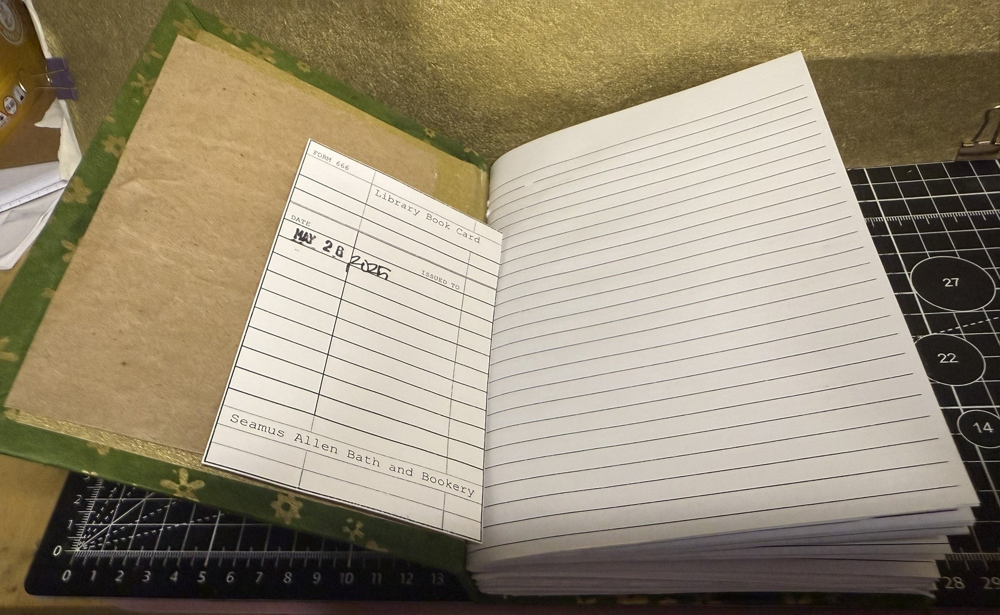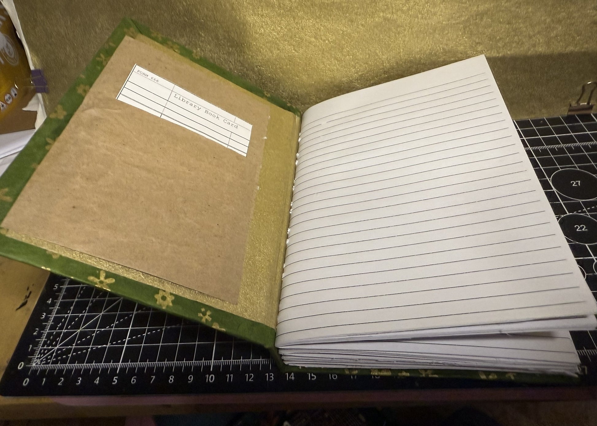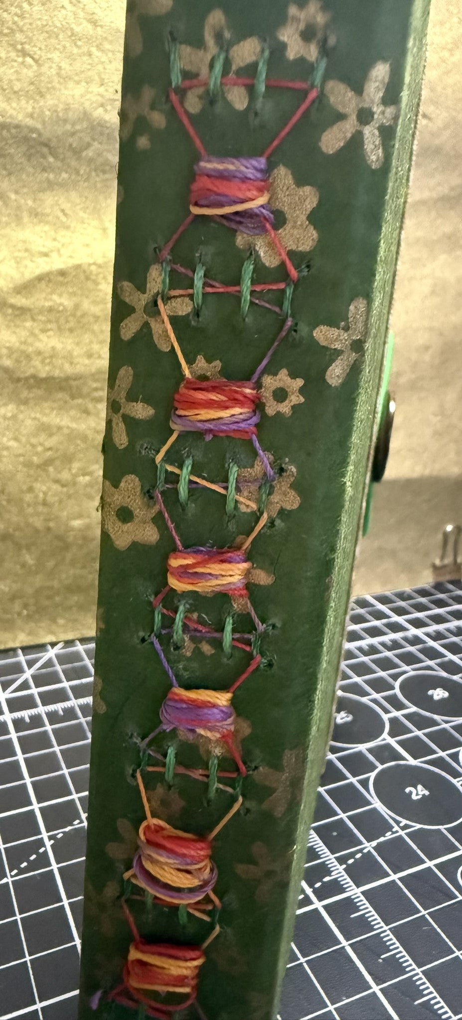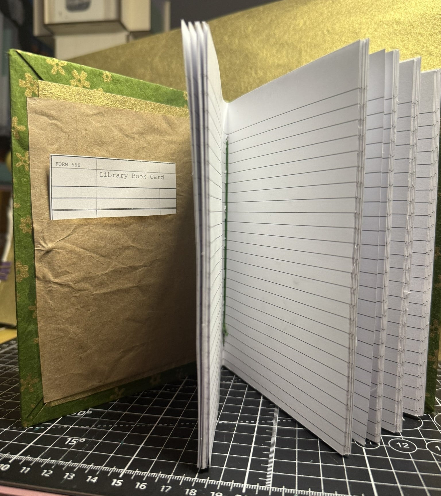 This journal is wrapped in green lokta paper with gold daisy motifs and lined with thick, luminous gold lokta inside. Signatures are stitched in green waxed thread, accented with red-to-purple gradient X patterns that are wound and wrapped for extra texture. Two ribbons — one thick and gold, one bright green — are looped through the back. Use either to keep it shut or save your page. A natural coconut shell button anchors the front. A hand-stamped library card inside marks the date this book was completed.