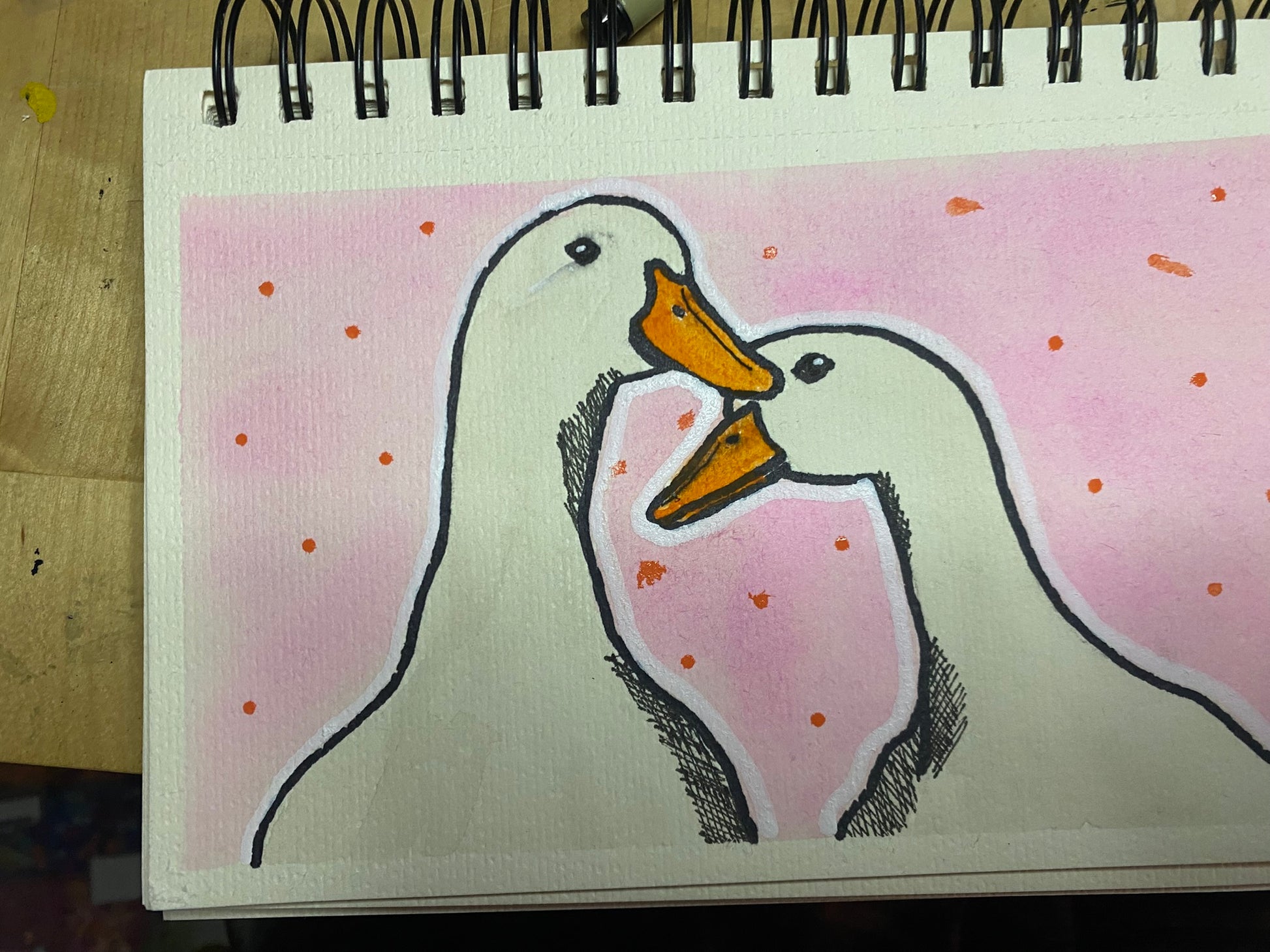 Two white geese with orange beaks (pink/orange dot background, kiss cut) – 3"