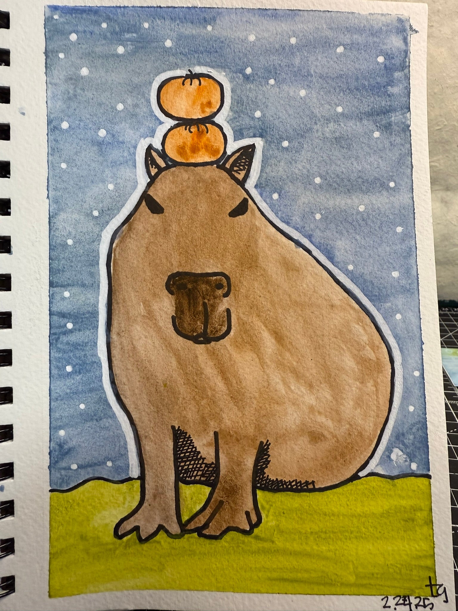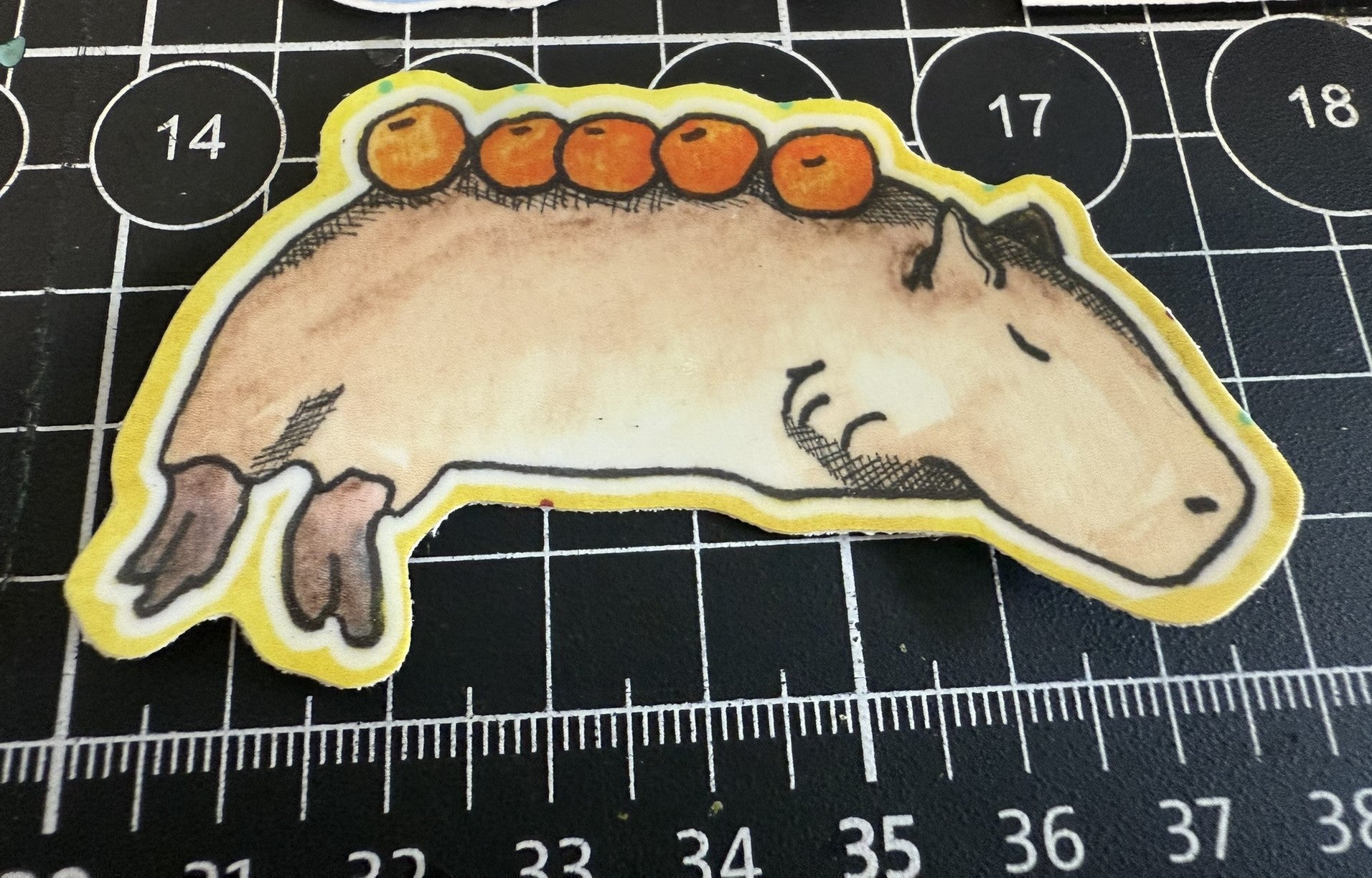 Sleeping Capybara with five oranges (yellow background) – 3"